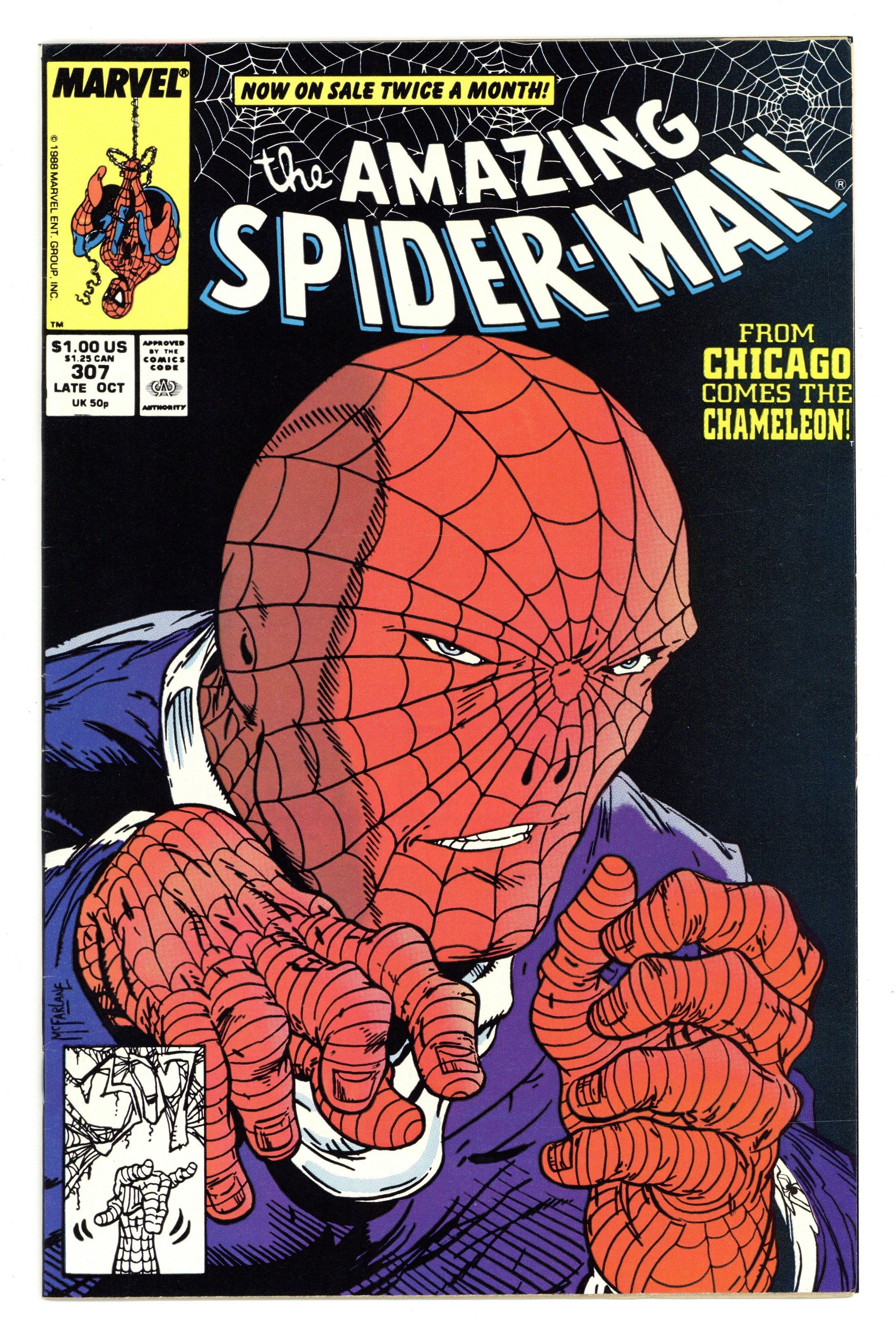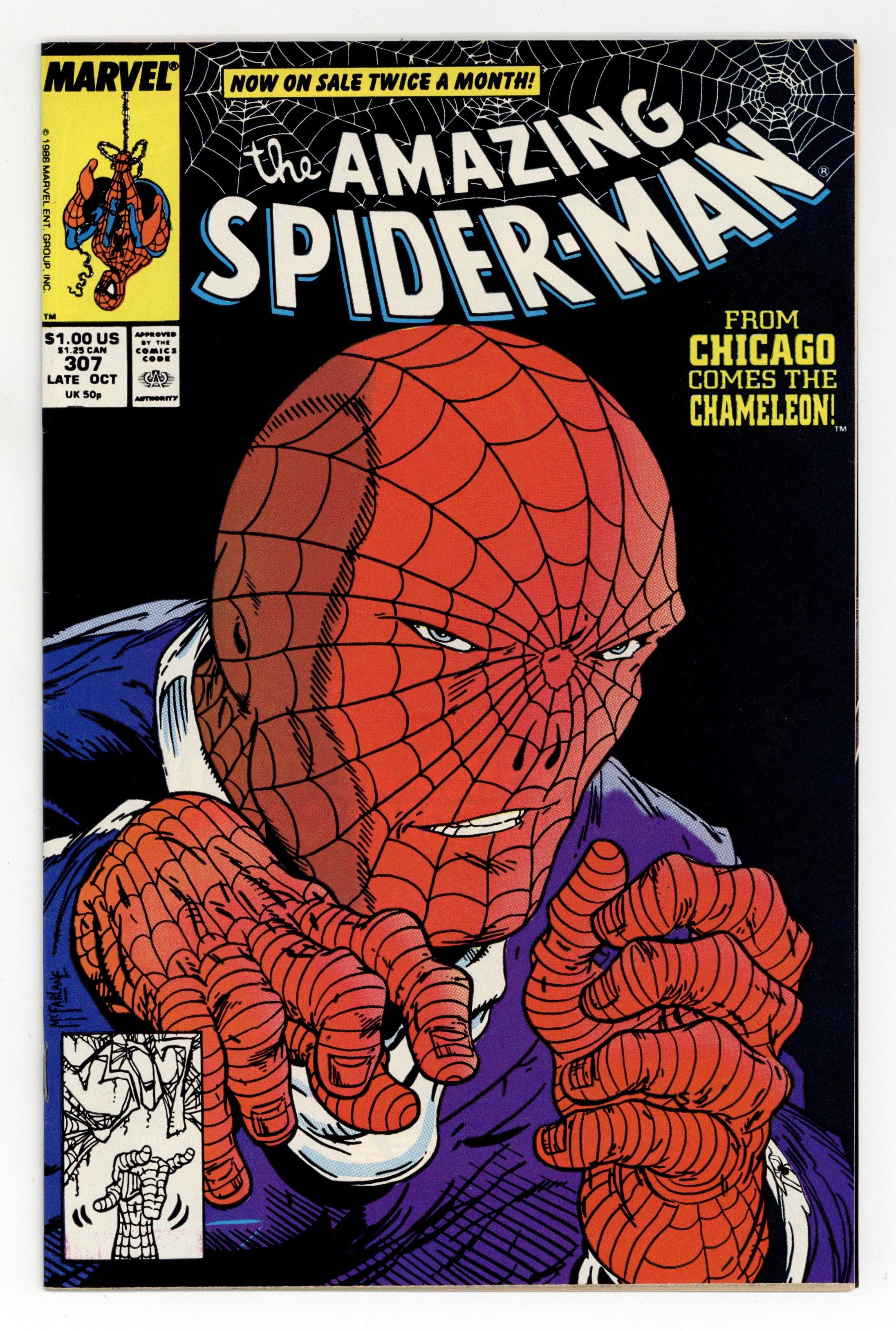 Tags: Marvel Legacy Numbering: Amazing Spider-Man (part 307), Spider-Man$14.50Direct Edition. "The Thief Who Stole Himself!" Script by David Michelinie. Art by Todd McFarlane. Cover by Todd McFarlane. Peter Parker's next stop on his book signing tour is the Windy City! This should be a quick and easy trip to Chicago for the web-slinger! However an old foe from long, long ago elects to embark on a new criminal career in the second city! Can the amazing one capture the Chameleon before his next endeavor begins? Spidey will have to spot him first! In the meantime back in Manhattan, the deranged Jonathan Caesar makes his move on Mary Jane! Hurry home Spider-Man! (Note: The Chameleon previously battled the wall-crawler in Amazing Spider-Man 186.) 36 pages. Cover price $1.00.