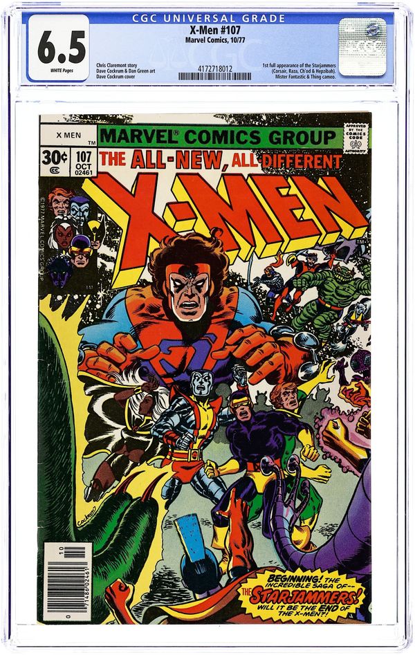 "Where No X-Man has Gone Before!" Part 2 of 3. Guest-starring the Starjammers (1st full appearance). Story by Chris Claremont. Art by Dave Cockrum and Dan Green. Story continued from Uncanny X-Men #105. Thanks to the awesome power of Phoenix, the X-Men have arrived on the far side of the universe. However things go from bad to worse when they are greeted by a small army of super-beings under the thrall of a sadistic madman. NOTE: 1st appearance of the Starjammers - Raza and Hepzibah - and the Shi'ar Imperial Guard. 36 pgs. Cover price $0.30.