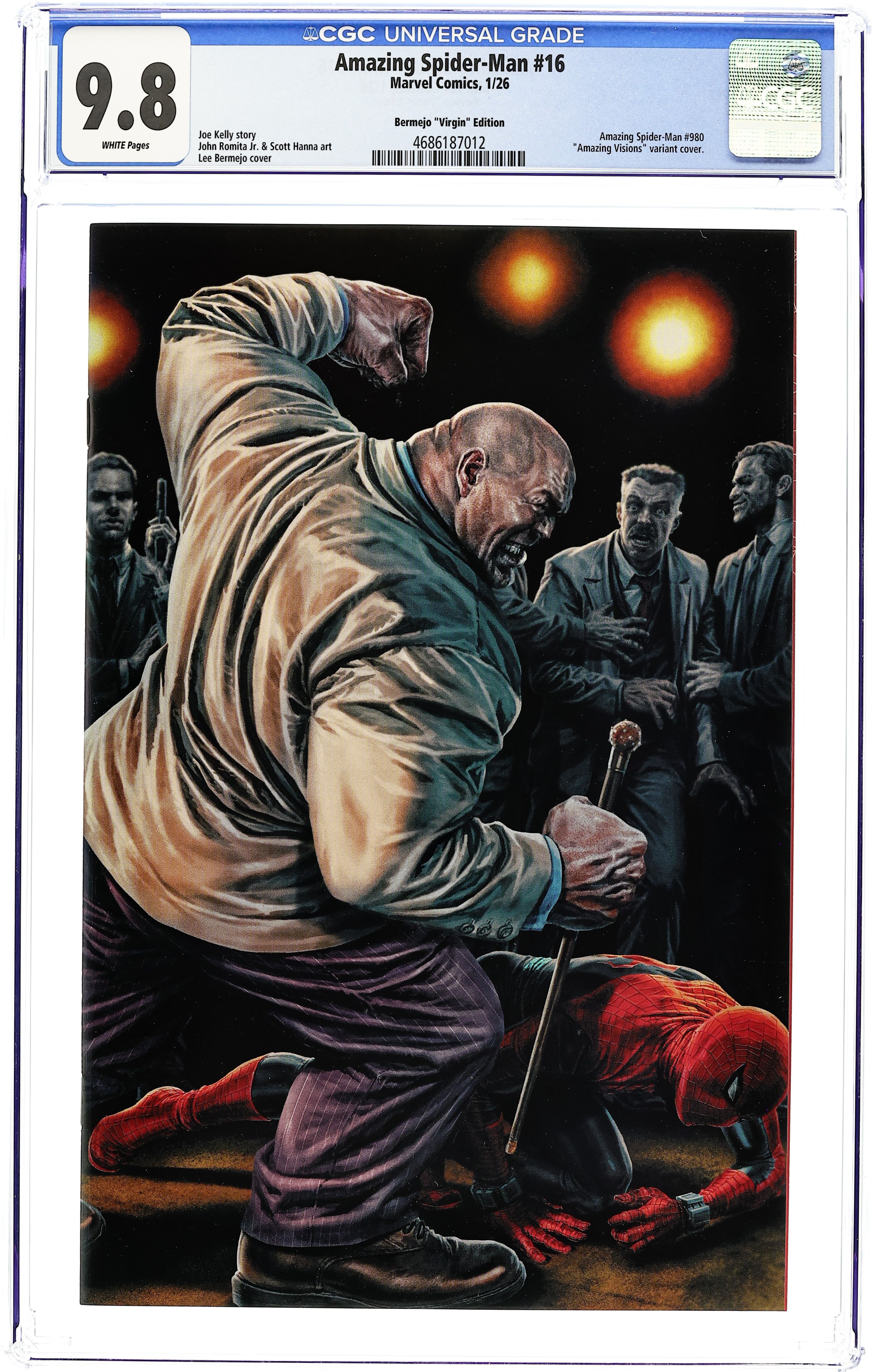 Limited 1 for 100 Retailer Incentive Variant Cover. (W) Joe Kelly (A) John Romita Jr. (CA) Lee Bermejo THE RESOLUTE SPIDER-SLAYER! Part of being Spider-Man is facing horrific scientifically wondrous SPIDER-SLAYERS! This new Spider-Slayer is particularly dangerous and endangers not only Spider-Man but the new teen hero KINTSUGI! Aunt May drops some wisdom that you won't forget anytime soon! Cover price $4.99.