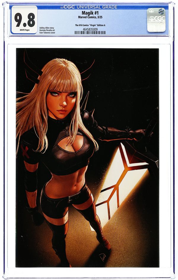 The 616 Comics Exclusive Virgin Cover by Ivan Talavera. Written by Ashley Allen. Art by German Peralta. THE MYSTIC MUTANT GOES DEMON HUNTING IN HER OWN NEW, ONGOING SERIES! The X-Man Ilyanna Rasputina strikes out on her own with new allies and dark powers arrayed against her. Something ancient has awakened beneath the Alaskan ice. Unfortunately for it, that's Magik's territory now! Written by rising star Ashley Allen (X-MEN: BLOOD HUNT - MAGIK, MARVEL ZOMBIES: BLACK, WHITE & BLOOD) and illustrated by the incomparable Germán Peralta (LOKI, BLACK PANTHER), this is a stylish, high-octane demon-hunting adventure starring the fiercest X-Man of them all! 32 pages, full color. Rated T+