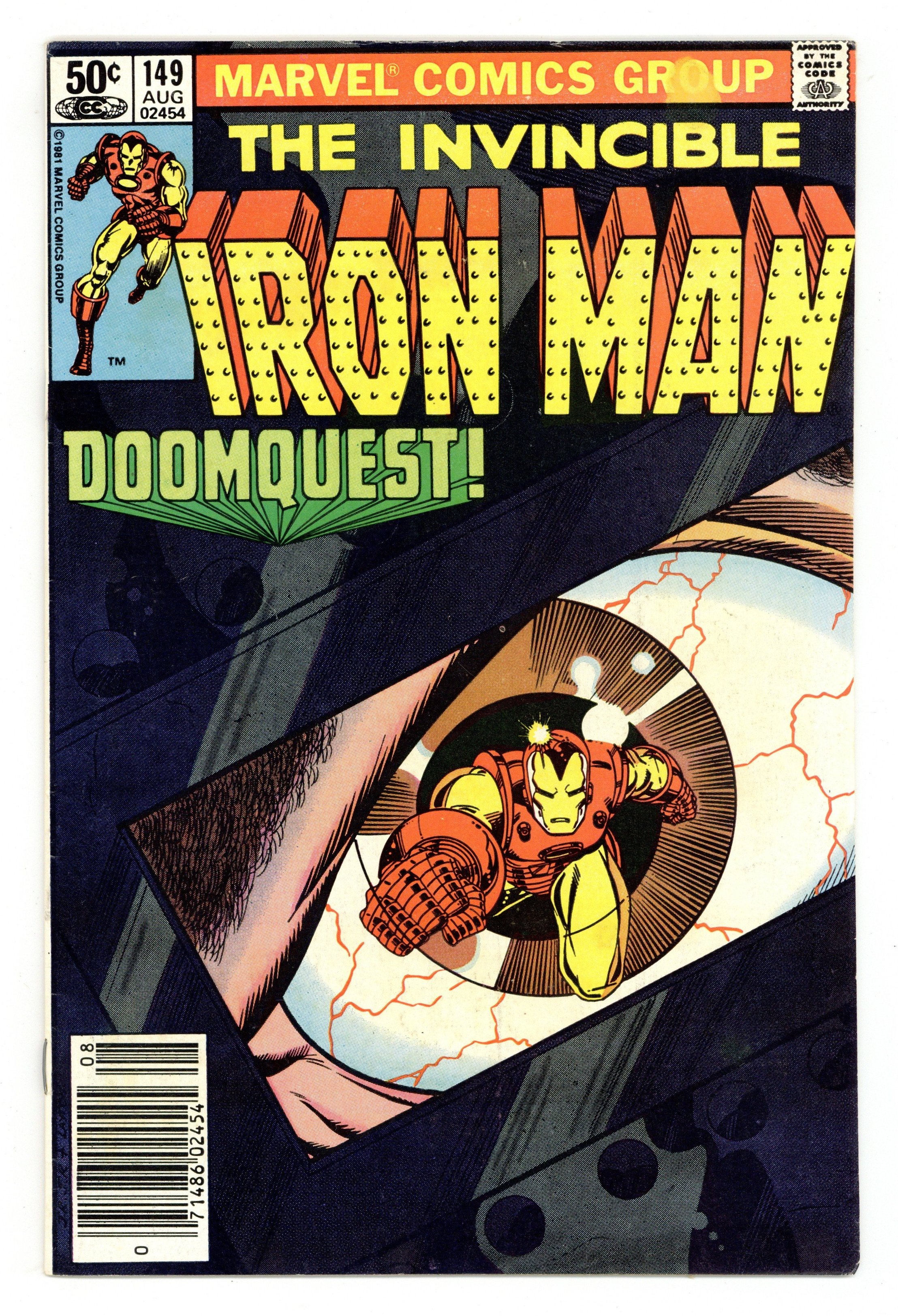 Newsstand Edition. "Doomquest" Part 1 of 2. Plot by David Michelinie and Bob Layton. Script by David Michelinie. Art by John Romita Jr. (breakdowns) and Bob Layton (finishes). Cover by John Romita Jr. and Bob Layton. It's the golden avenger's first one-on-one encounter with Doctor Doom! After electrical components (manufactured by Stark International) are accidentally sold and shipped to Latveria, Tony Stark flies to the small Balkan country to get them back! However to recover S.I.'s components, Shell-Head must pay a visit to Castle Doom! In the past the invincible one always had the Avengers by his side when confronting the (deposed) monarch of Latveria! But today Iron Man will match brains, brawn, and armor with Victor Von Doom all by himself! Cameo appearance by Jim Rhodes. (Notes: Iron Man and Doctor Doom briefly clashed in Super-Villain Team-Up 9 and Avengers 156. This memorable two-part story was reprinted in 1994 in the trade paperback: Iron Man vs. Doctor Doom; and again in 2008 in the hardcover: Iron Man Doomquest.) 32 pages. Cover price $0.50.