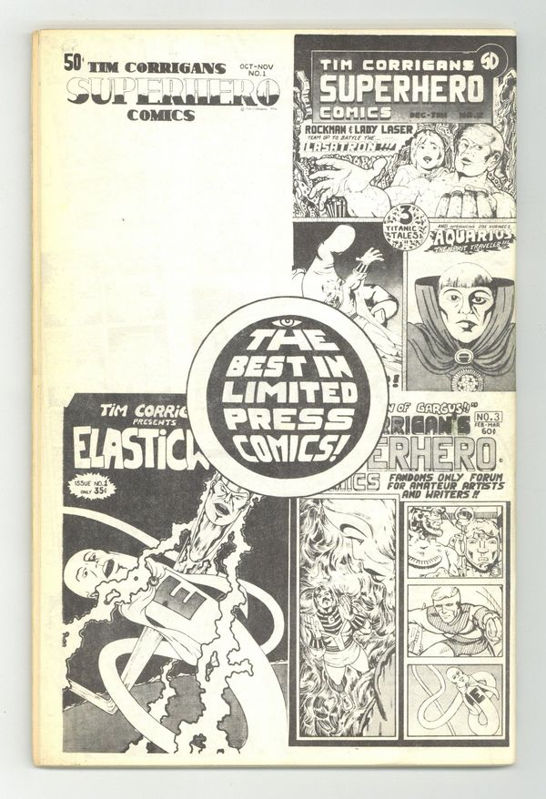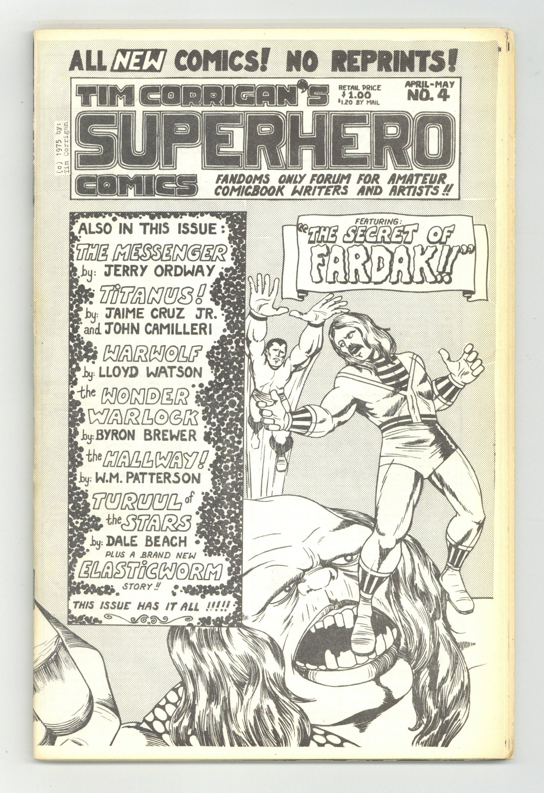 Published Apr 1975 by Tim Corrigan.$33.00Comics written and illustrated by Tim Corrigan, whose art is highly influenced by Jack Kirby. 64 pages, B&W. Cover price $1.00.