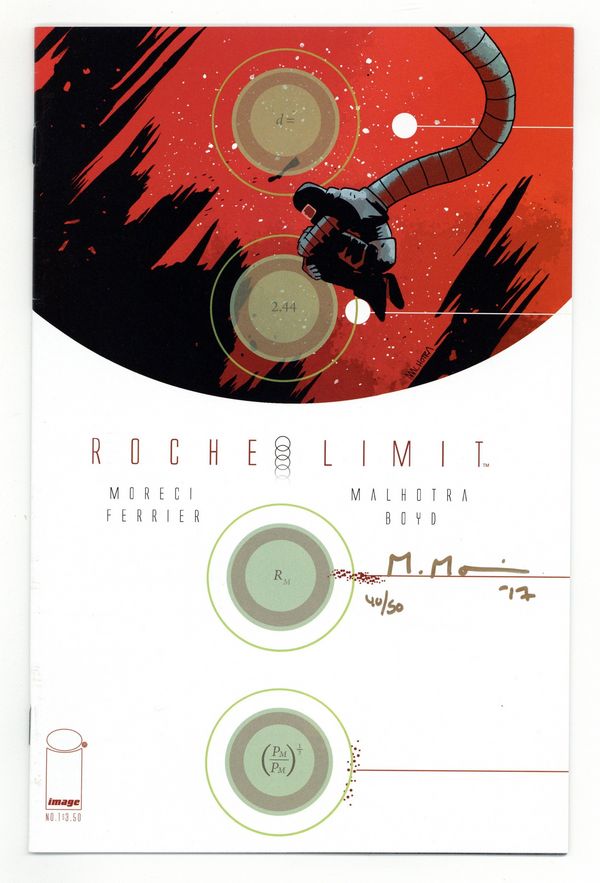 $7.00Dynamic Forces Signed Edition - Limited to 50 Signed Copies. Signed by Michael Moreci in gold ink. Includes Certificate of Authenticity from Dynamic Forces. Written by Michael Moreci. Art and Cover by Vic Malhotra. 'OUR DESTINY IS THE STARS, AND I WILL LEAD US THERE.' Twenty years after this promise, billionaire Langford Skaargard's dream of cosmic exploration is no more. Roche Limit, a colony situated on the cusp of a mysterious energy anomaly, is a melting pot of crime and terrible secrets. When Bekkah Hudson goes missing, the search to find her will plunge her sister and a cadre of the colony's underworld figures into an odyssey that reveals a grim future for mankind. Cover price $3.50.