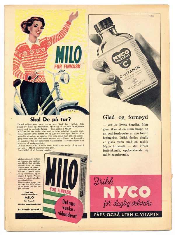 Norwegian weekly family magazine featuring articles on food, interior decoration, health, fashion, and beauty. 10.5" x 14", 24 pages, PC/PB&W. Note: All text in Norwegian.