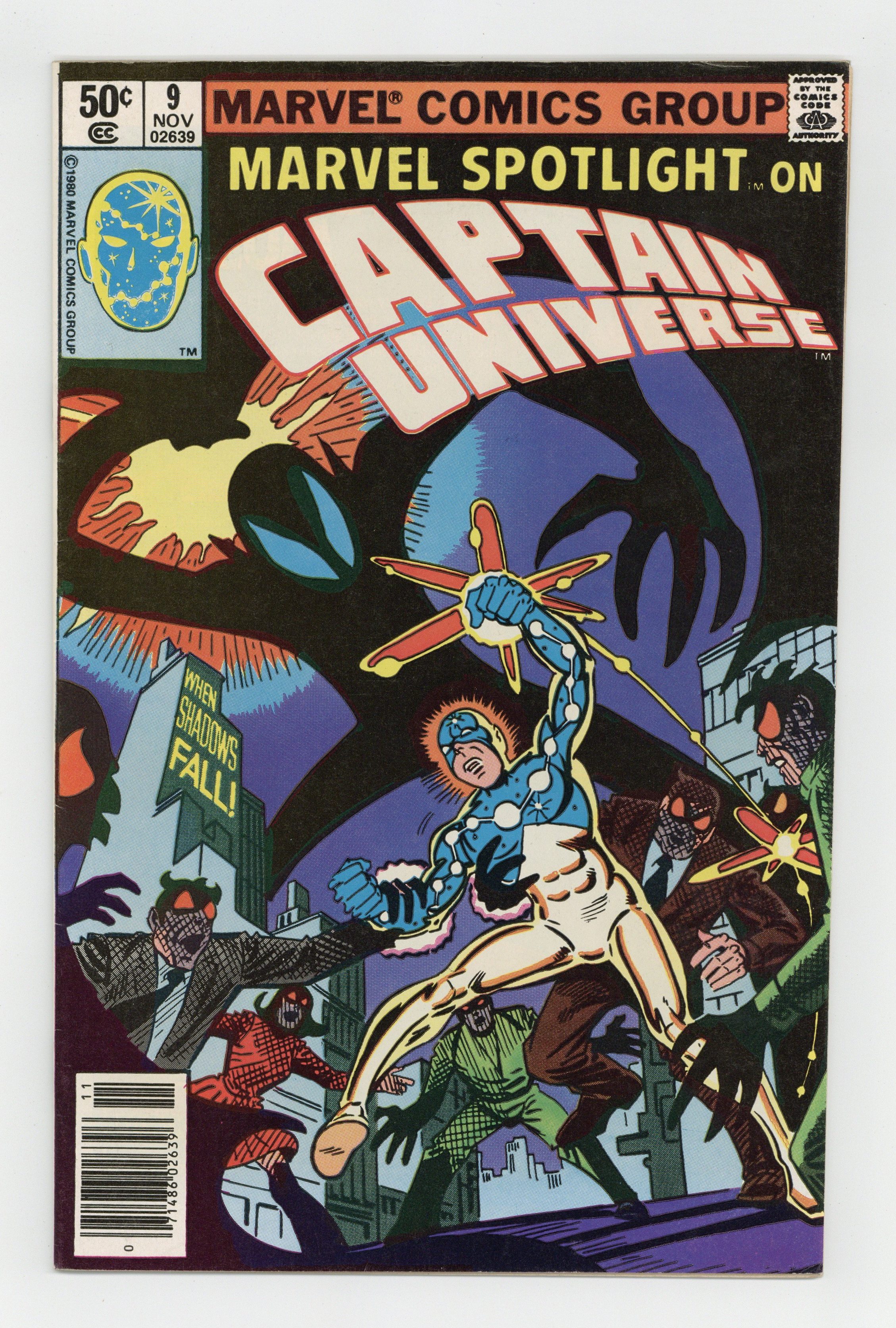 Direct Edition. Marvel Spotlight on Captain Universe - "The Mystery of Mister E!" Written by Bill Mantlo. Art and cover by Steve Ditko. When a gathering darkness threatens to eclipse all life on Earth only the cosmic force known as Captain Universe has the power to save it! 32 pages, FC. Cover price $0.50.