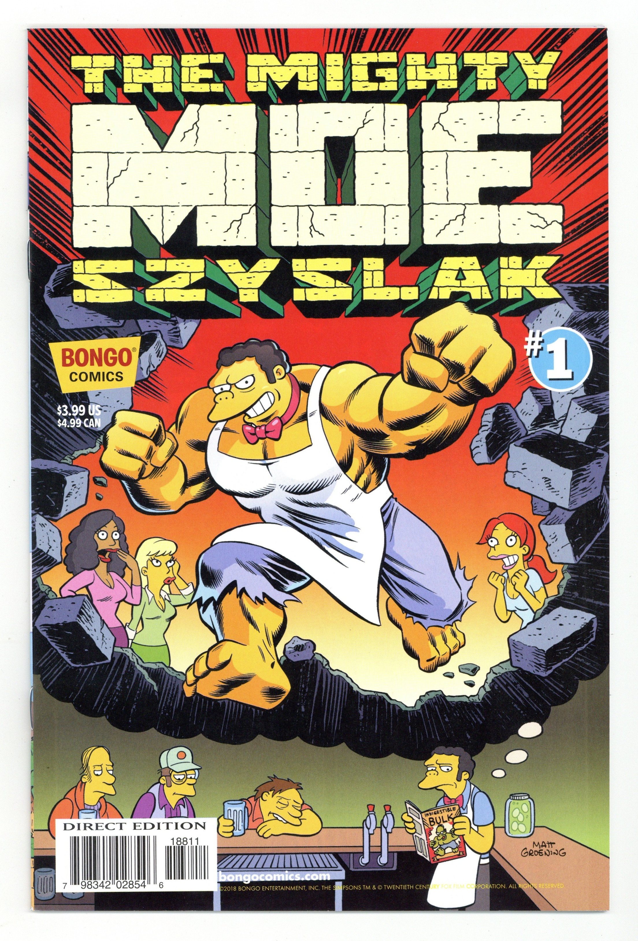 $16.00Story by Ian Boothby and Terry Delegeane. Art by Phil Ortiz and Mike Kazaleh. Cover by Jason Ho. Springfield's belligerent bartender takes his best shot at a one-shot! First, Moe and Barney go on an excellent time-traveling adventure in search of love... and beer! Then, Moe goes in search of his long-lost, evil twin brother. And Moe waxes nostalgic over his lucky bar rag. All this and more Mighty Moe tales await you! Cover price $3.99.