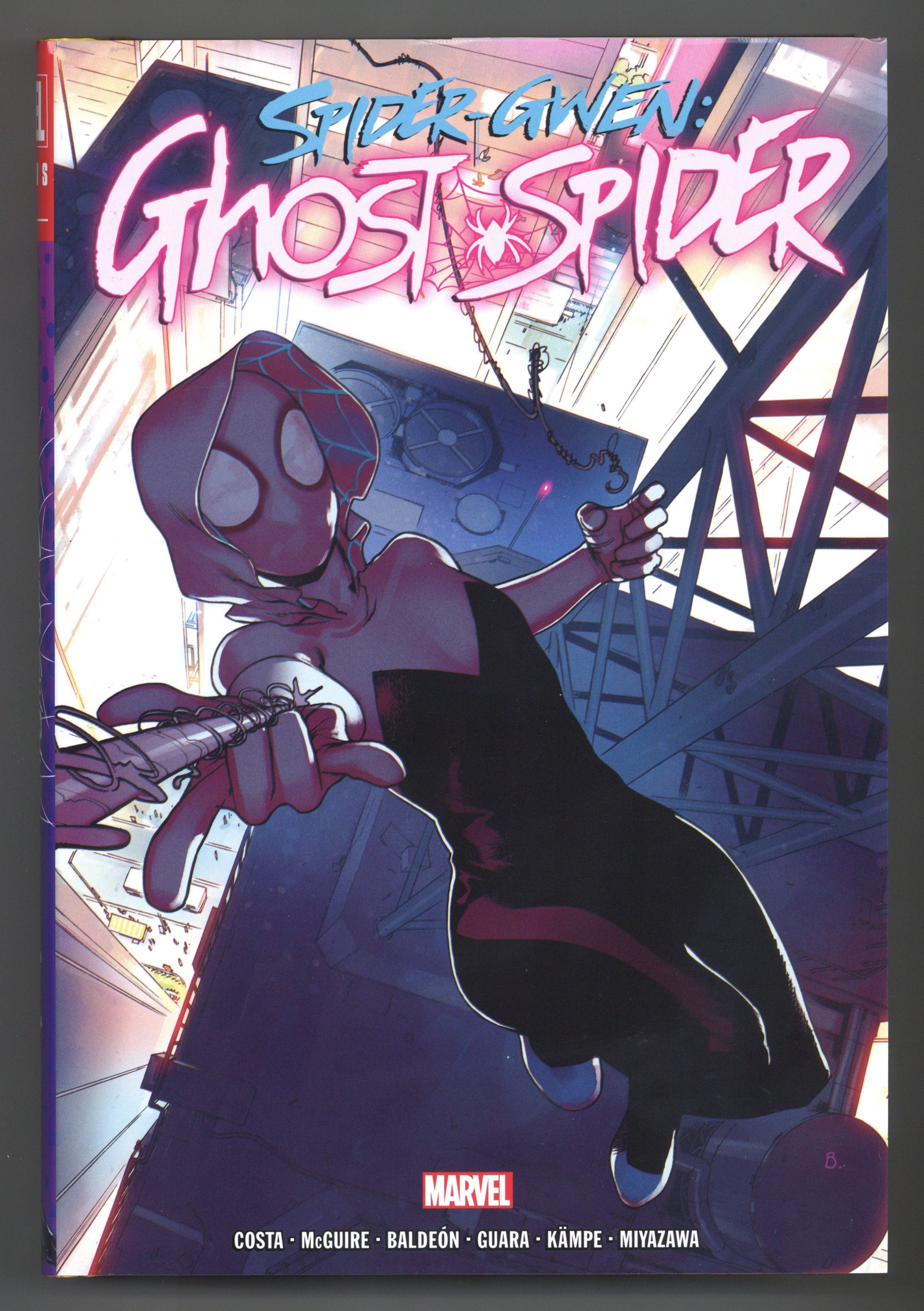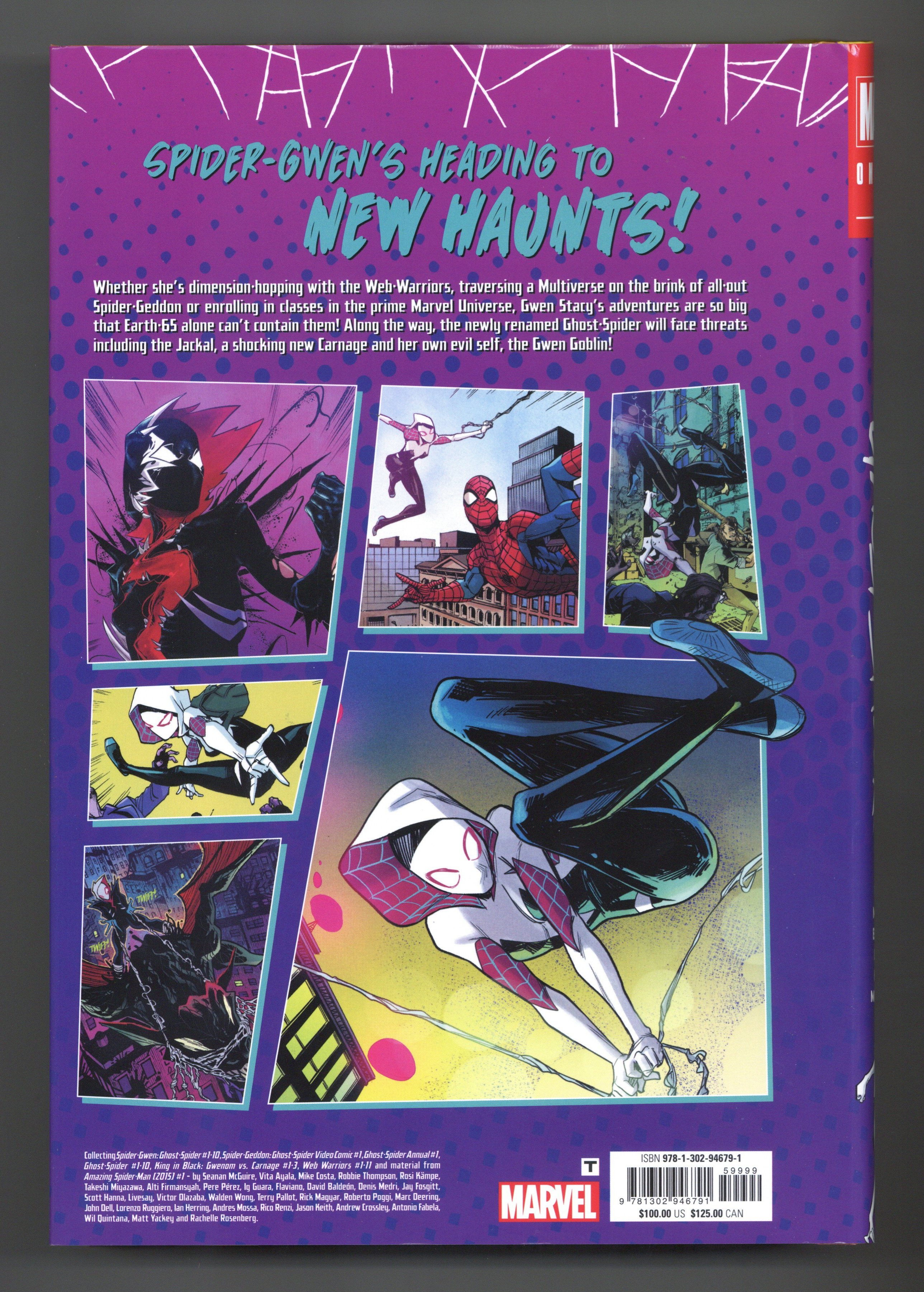 2nd and later printings. Collects Spider-Gwen: Ghost Spider (2018) #1-10, SPIDER-GEDDON: GHOST-SPIDER VIDEO COMIC, Ghost-Spider (2019 Marvel) #1-10, Ghost-Spider (2019 Marvel) Annual #1, King in Black: Gwenom vs. Carnage (2021 Marvel) #1-3, Web Warriors (2015 Marvel) #1-11 and material from The Amazing Spider-Man (2015 4th Series) #1. Written by Seanan McGuire, Vita Ayala, Robbie Thompson, and Mike Costa. Art by Tim Eldred, Alti Firmansyah, Rosi Kampe, Takeshi Miyazawa, Ig Guara, Pere Perez, Flaviano, Scott Hana, Denis Medri, Livesay, Walden Wong, Victor Olazaba, Roberto Poggi, Rick Magyar, Terry Pallot, Marc Deering, Jay Fosgitt, John Dell, and David Baldeon. Cover by Bengal. Back Cover by Takeshi Miyazawa, Rosi Kampe, Ig Guara, and Flaviano. Afterword by Devin Lewis. Gwen Stacy returns...as Ghost-Spider! But the interdimensional events of Spider-Geddon are about to rock her world, and soon, she will face her own evil self: the Gwen Goblin! Meanwhile, Mary Jane's vision for their band is driving Gwen crazy, her father is pressuring her to return to school and something sinister stalks the New York City of Gwen's Earth-65. So Gwen enrolls in classes in the Marvel Universe instead! But the newest student at ESU has caught the Jackal's deadly eye! And when the King in Black plunges Gwen's adoptive home into darkness, get ready for Gwenom vs. Carnage! Plus: Whatever happened to the Susan and Johnny Storm of Earth-65? And look back to Gwen's time with the dimension-hopping Web-Warriors! Hardcover, 8 1/2-in. x 11-in., 824 pages, full color. Rated T Cover price $100.00.