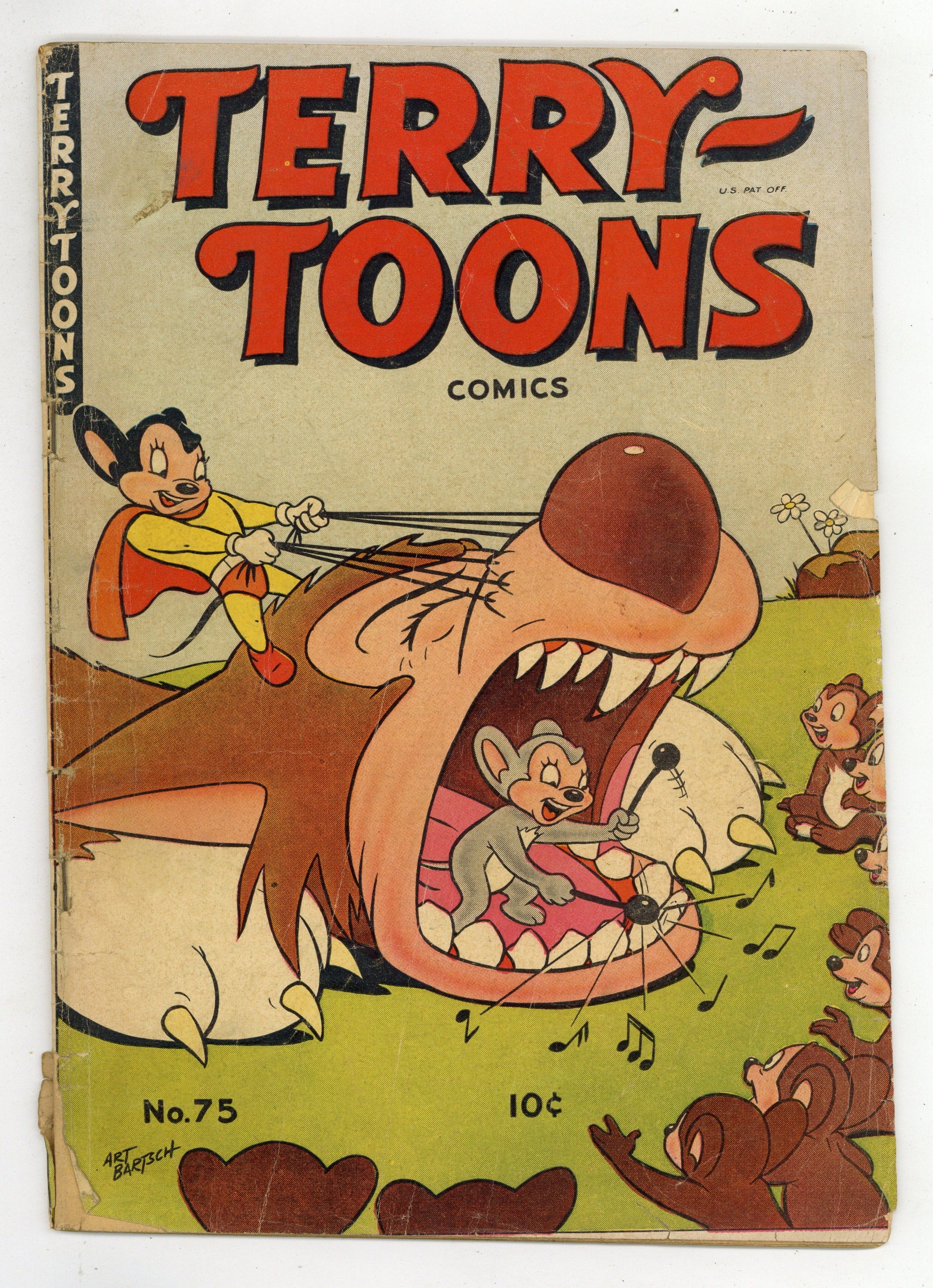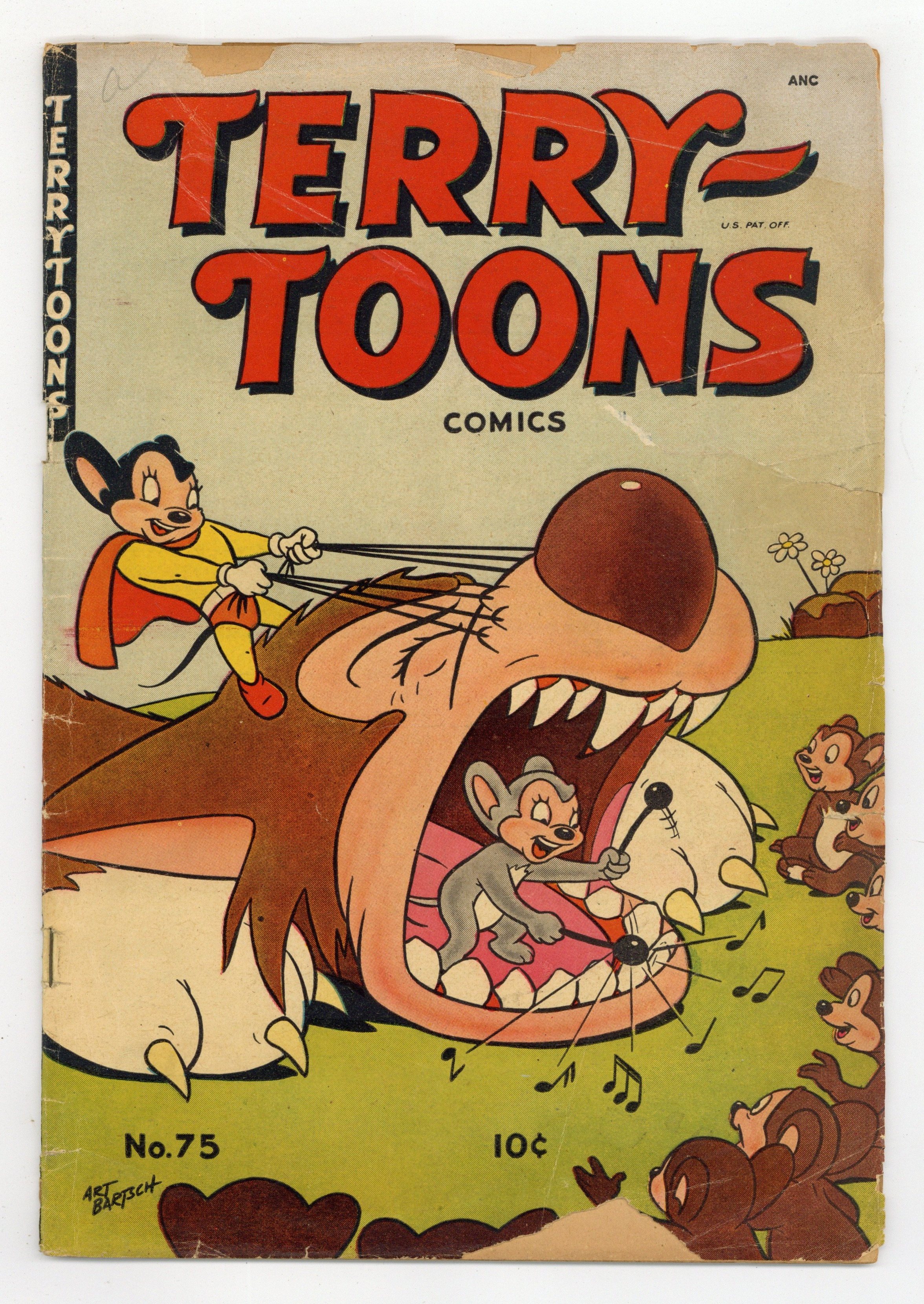Cover by Art Bartsch. Art by Art Bartsch, Jim Tyer and Connie Rasinski. St. John presents the comics adventures of the characters of animator Paul Terry's studio. Mighty Mouse's foe The Claw films an action movie that's actually a trap for Mighty Mouse. Heckle and Jeckle invent a robot salesman for a department store, but the other employees are not impressed. Sourpuss's good and bad selves get into a fight when he sees a chance to take advantage of Gandy Goose. Dinky: Rudy Grins Weight; Heckle and Jeckle: How to Handle Crowds; Dinky; Mighty Mouse: Star Performer; Gandy Goose; Dingbat: No Lamb for Dinner; Heckle and Jeckle: Dimwit Does the Job; Sourpuss: The Super-Cleaner; Gandy Goose. 32 pages, Full Color. Cover price $0.10.