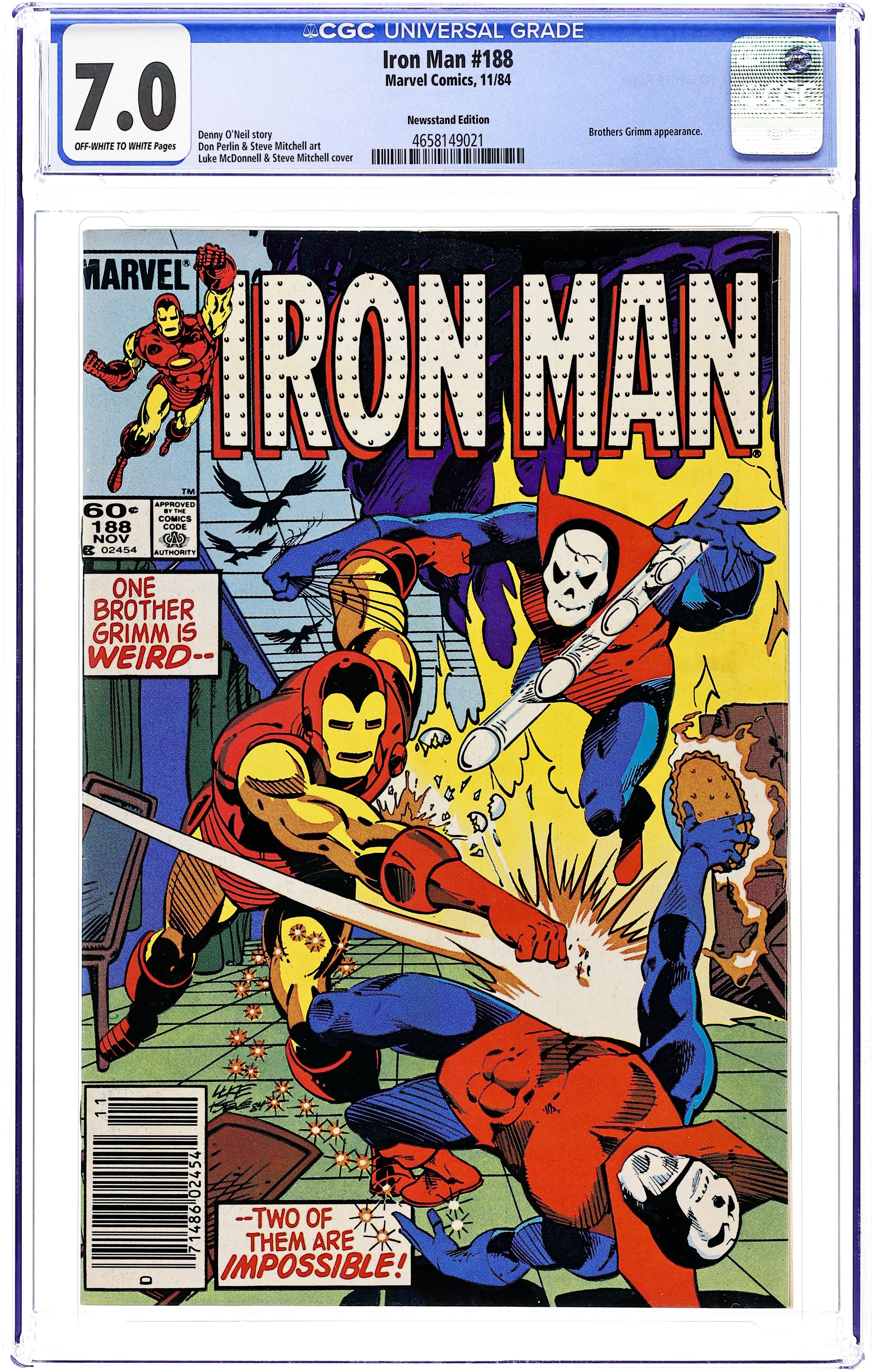 Newsstand Edition. "And Grimm Shall Be Their Name!" Script by Denny O'Neil. Pencils by Don Perlin. Inks by Steve Mitchell. Cover by Luke McDonnell and Steve Mitchell. The California entrepreneurs at last have a name for their new company: Circuits Maximus! And to celebrate their grand opening; Morley, Clytemnestra, Tony, and Rhodey go out to dinner to an upscale restaurant! However a couple of locals are very upset with the restaurant's owner! And they go out to dinner...dressed as the Brothers Grimm! When Shell-Head engages the strange duo, he quickly learns that the pernicious pair are full of tricks! And they must be bested with brainpower as opposed to firepower! First appearance of the Grimes brothers as the Brothers Grimm. (Notes: The costumes of the Brothers Grimm previously appeared in Spider-Woman(1978-1983 1st series) #12. This story takes place close to the events in Iron Man Annual #7.) 32 pages. Cover price $0.60.