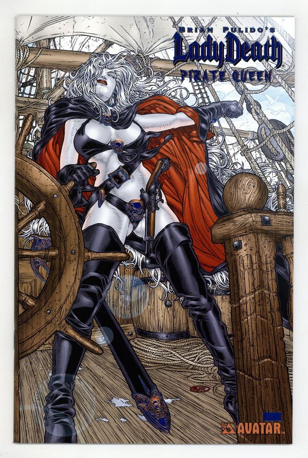 $17.00Royal Blue Foil Cover by Juan Jose Ryp - limited to 100 copies. Includes Certificate of Authenticity from Avatar. By Brian Pulido & Wellington Alves Don't miss this all-new, full-color, super-sized Lady Death epic from creator Brian Pulido and artist Wellington Alves! Long after her journeys in the Blacklands, Lady Death, along with her Skeleton crew, were merciless pirates who raided merchant ships during the black age of piracy on the blood red seas. But all that may be at an end as Lady Death robs the booty of captain Mad Morgan Flintlock: vampire pirate! So weight anchor and set sail for a tale of adventure and terror like likes of which you've never seen before! Featuring these stunning covers: Regular, Wraparound, and Attack covers from super-star Juan Jose Ryp, Lopez by Rafa Lopez, Amorim by Di Amorim, Seafarer, Premium and special Leather cover (limited to 600 copies) all by Daniel HDR.
