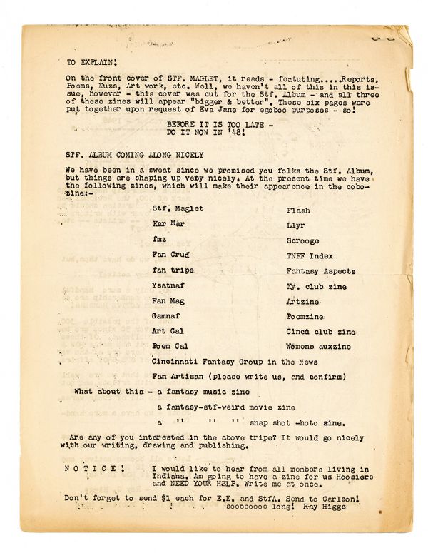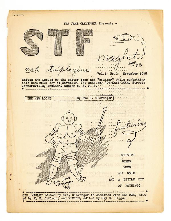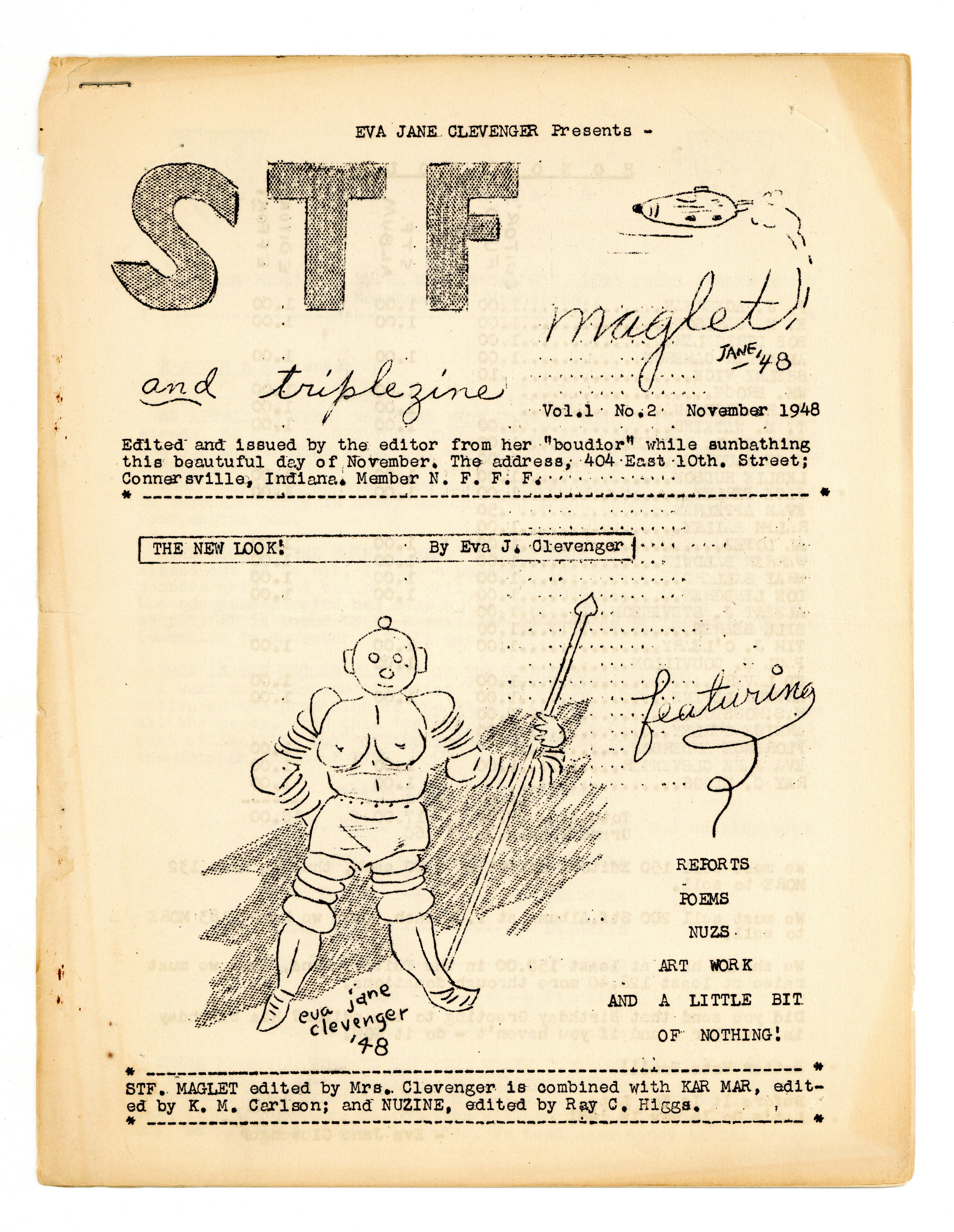 Published Nov 1948 by Eva Jane Clevenger.$65.00Combined fanzine from Indiana that included STF Maglet, Kaymar, and Nuzine. 8.5" x 11", 6 pages, B&W.