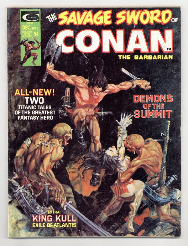 Starts Apr 27 Conan stars in "At the Mountains of the Moon-God." Script by Roy Thomas, pencils by John Buscema, inks by Pablo Marcos. Conan also stars in "Demons of the Summit." Script by Thomas, art by Tony DeZuniga. Adapted from the story by Bjorn Nyberg. Blackmark stars in "The Testing of Blackmark." Script and art by Gil Kane (art assist by Neal Adams); reprints chapter 3 of the Bantam Books paperback. Kull stars in "Kull of Atlantis." Text by Robert E. Howard (from the story "Exile of Atlantis"), art by Barry Windsor-Smith. Article about Kull, "The First Barbarian," by Lin Carter with illustrations by John Severin. Letter to the editor from writer Harlan Ellison. Alfredo Alcala frontispiece. Michael Kaluta cover. Cover price $1.00.