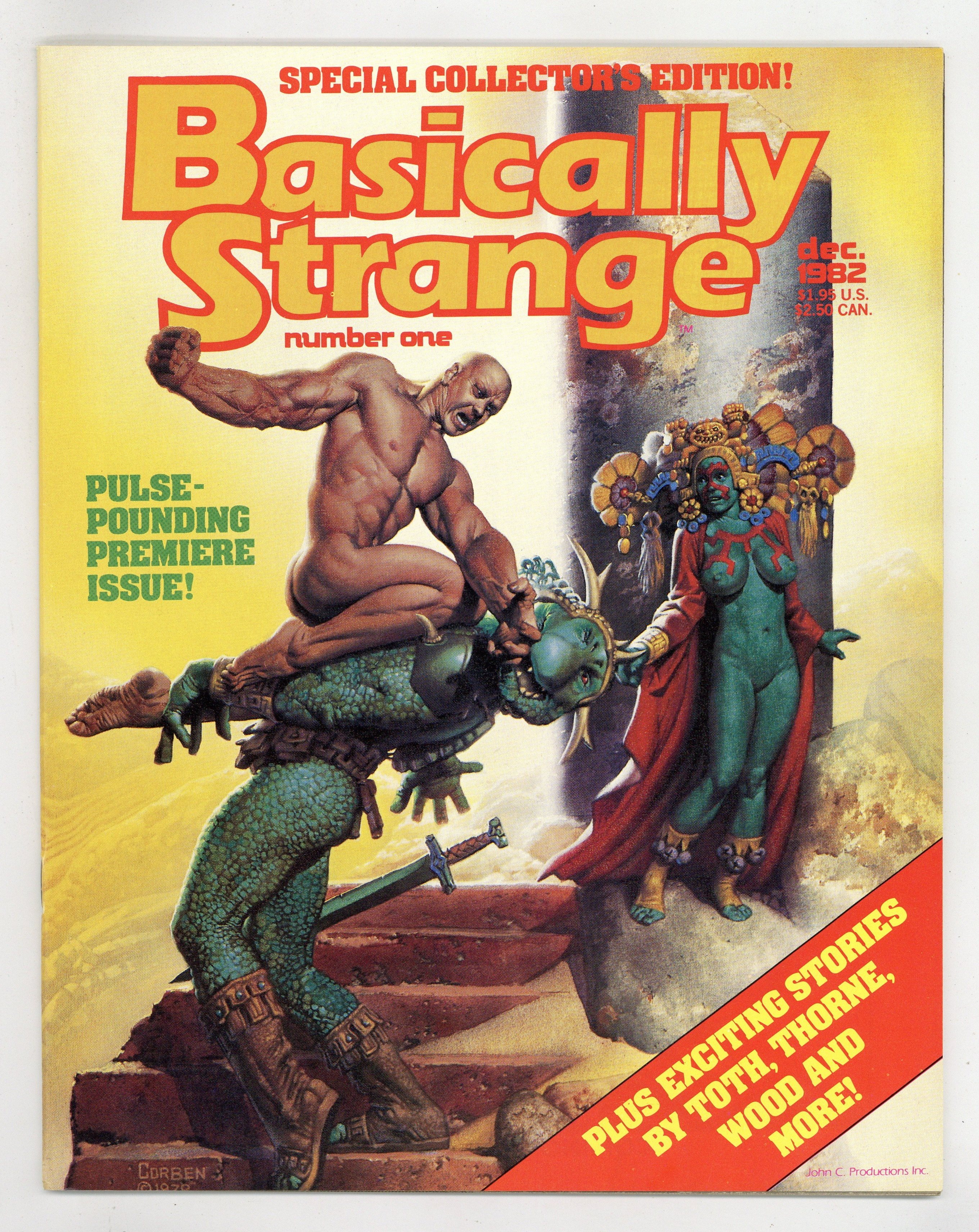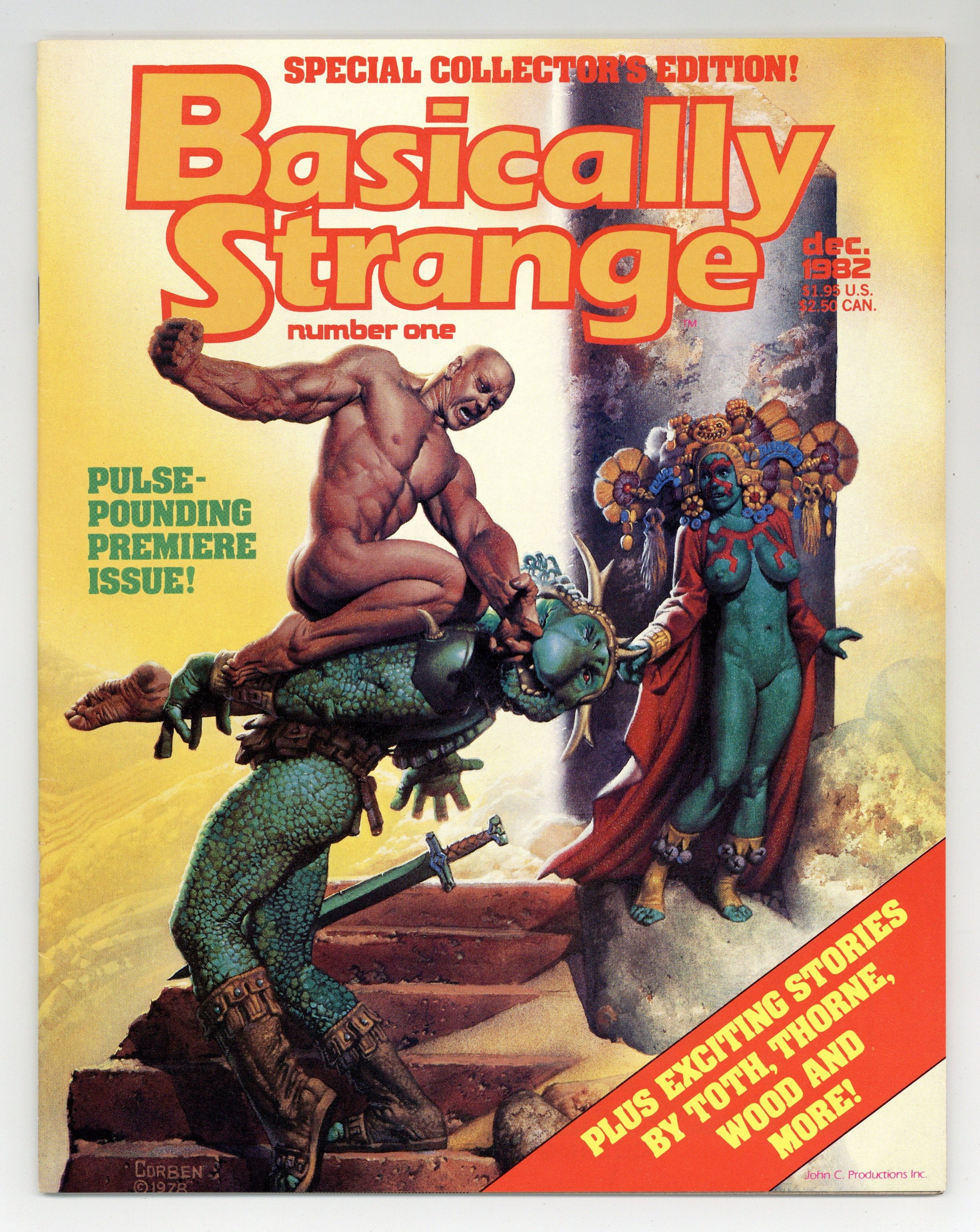 $14.00Cover by Rich Corben. Hall of Fame T.H.U.N.D.E.R. Agents ad. Review of Ridley Scott's 1982 science fiction film, Blade Runner. "The Man Who Tried To Kill Death," script by Marvin Channing, art by Alex Toth; Jacques makes a deal with death to extend his life. "Tetragrammaton," script by Tim Ryan, art by Rick Bryant. Winddreams: A Portfolio by Rick Bryant ad. "The Benefactor," script by T. Casey Brennan, art by Vincente Alcazar. "The Ultimate Power!", script and art by Wally Wood. "Death Is My Love's Name," script by Marvin Channing, art by Frank Thorne; An artist brings his painting of 'the perfect woman' to life. "The Creator," script and art by Bruce Jones. Pinup pages featuring fantasy art by Pepe Moreno (Spanish, aka Pepe Moreno Casares), Matthew Staples, and Bob Morello (aka Robert Morello), with short biographies of the artists following. Justice Machine ad. Magazine size. 52 pgs., B&W. Cover price $1.95.