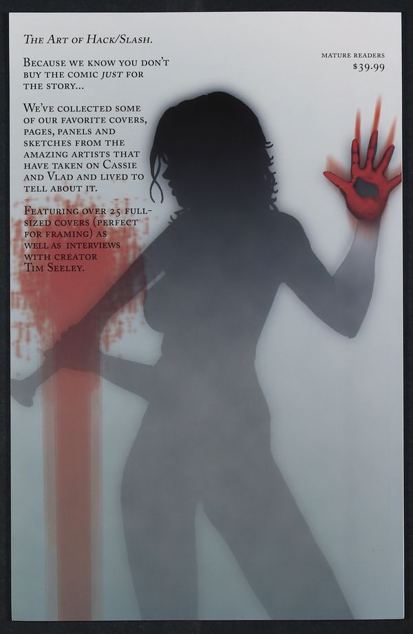 Kickstarter reprint of the 2010 Devil's Due publication. Cover by Tim Seeley. Art by Tim Seeley, Emily Stone, Ross Campbell, and Joe Jusko. Collecting the best covers, pin-ups, sketches and all around awesome Hack/Slash art into one impressive collectible art book. These pages are the perfect size for removal and framing! The must-have item for any fan of this indie-horror hit! Softcover, 11-in. x 17-in., 40 pages, full color. Cover price $39.99.