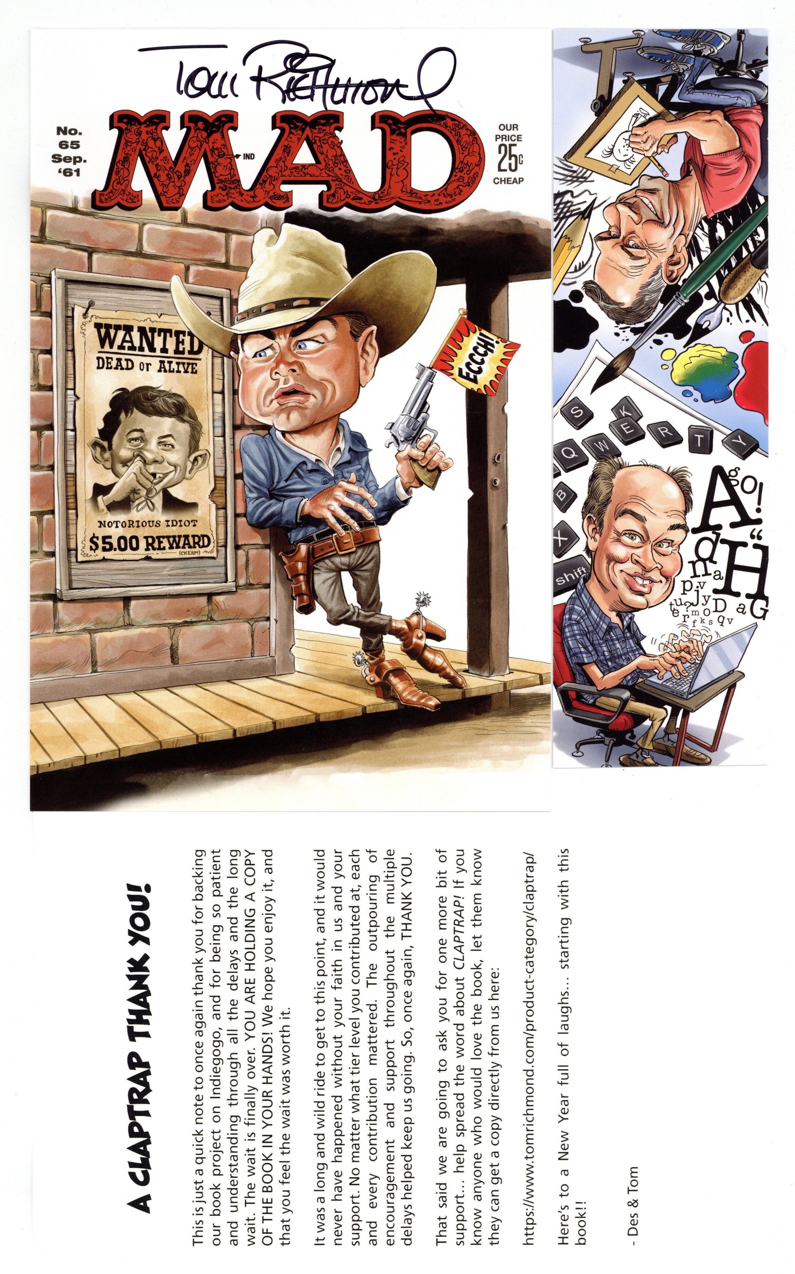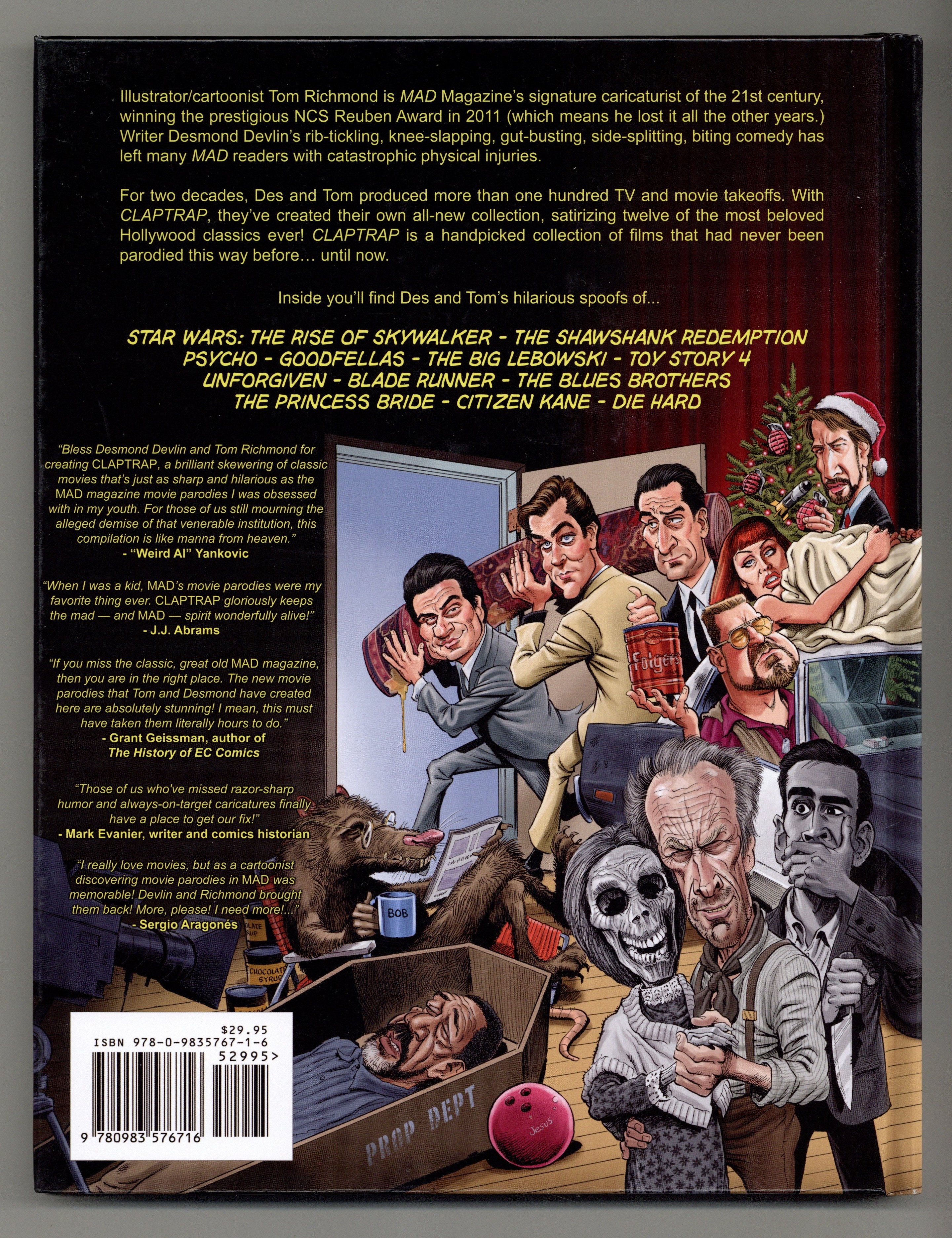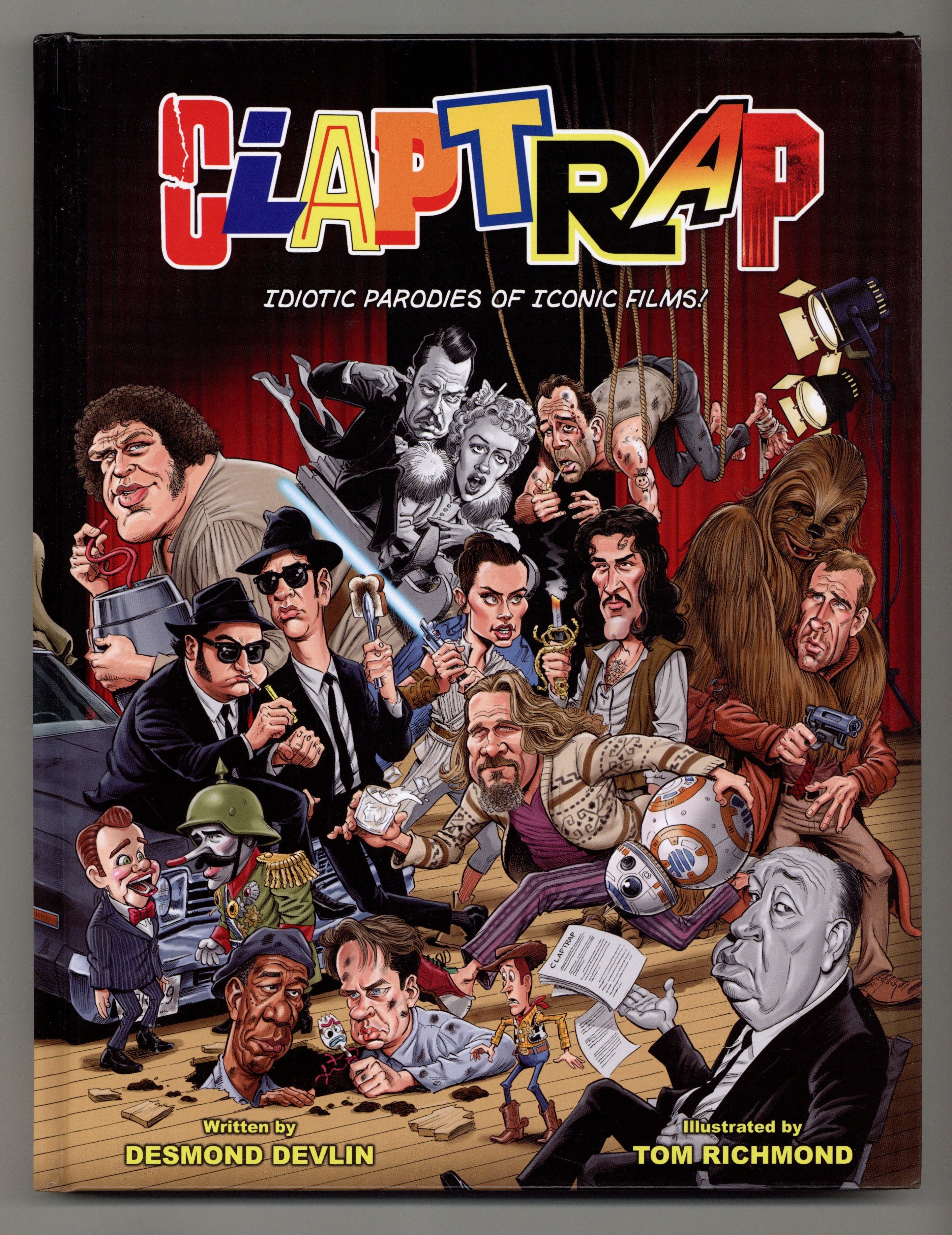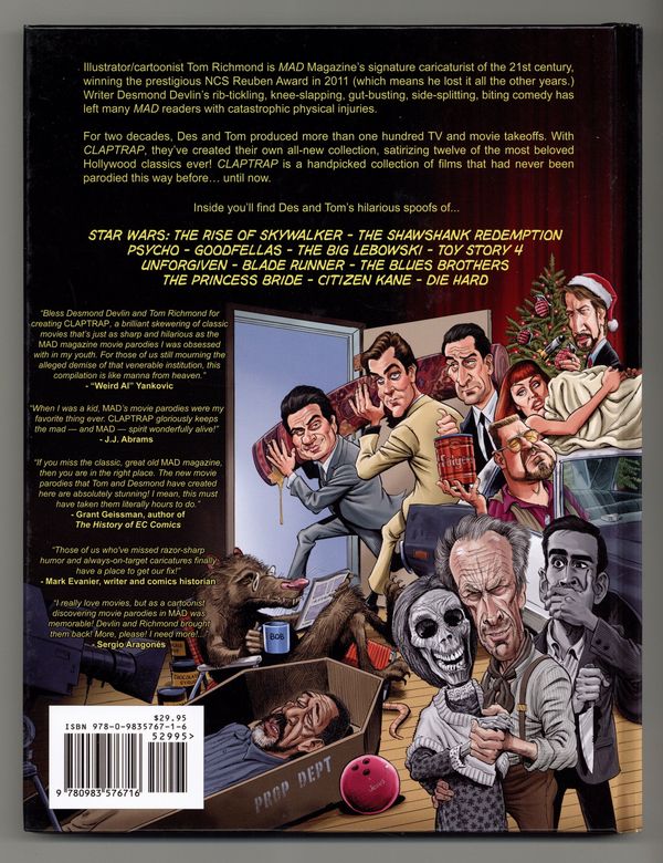1st printing. Written by Desmond Devlin. Art by Tom Richmond. CLAPTRAP is a hardcover, full color collection of twelve movie parodies by two longtime members of MAD Magazine's "Usual Gang of Idiots": Desmond Devlin and Tom Richmond. Plus other film related features and surprises! Hardcover, 9" x 11-1/2", 124 pages, full color. Cover price $29.95.