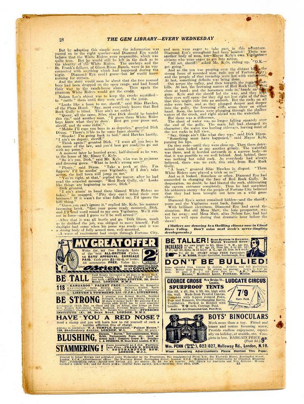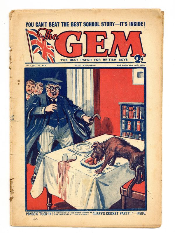 UK story magazine published by Amalgamated Press between 1907-1939, predominantly featuring the activities of boys at the fictional school St. Jim's. 7.5" x 11", 28 pages, B&W