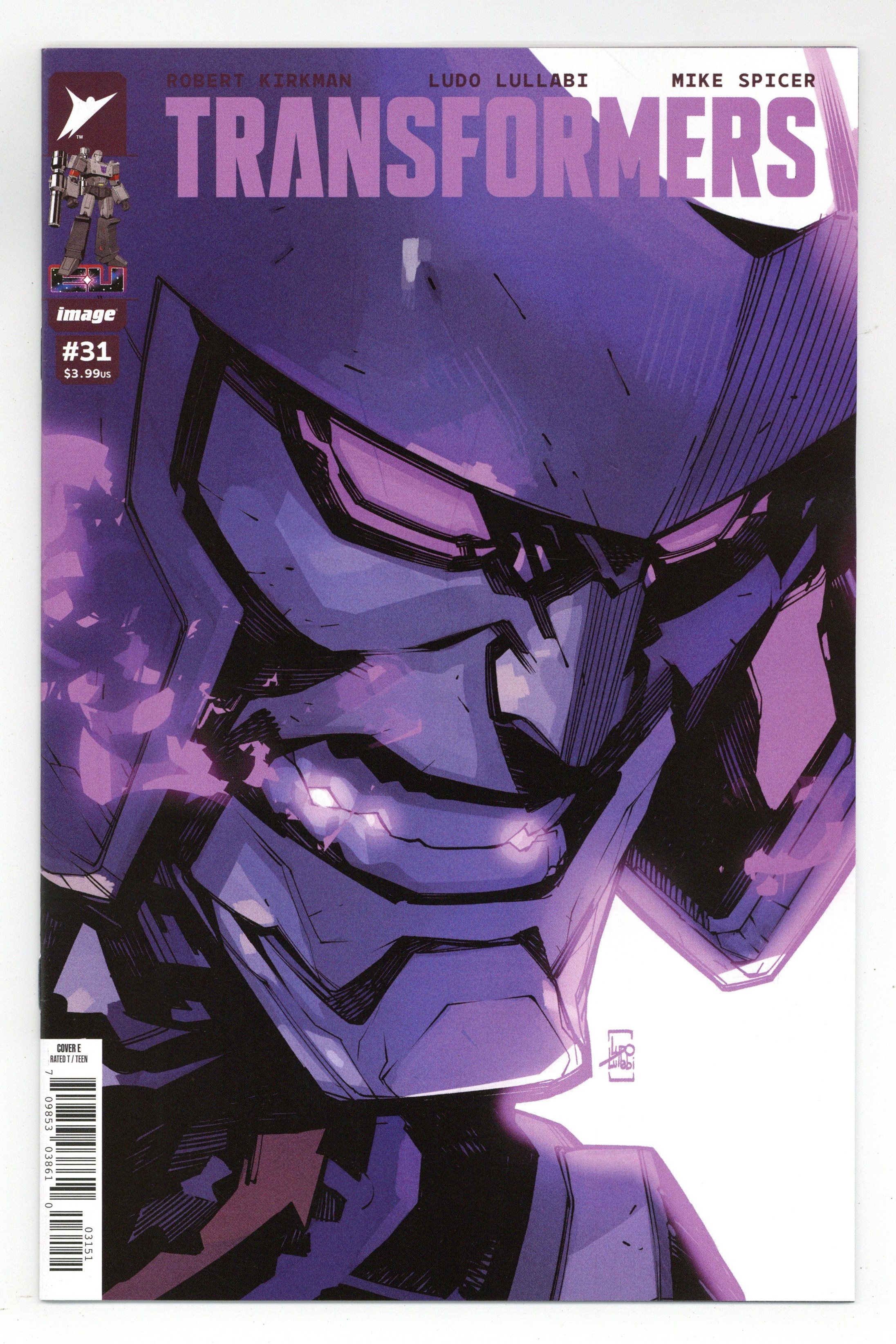 Tags: Transformers$24.00Limited 1 for 50 Retailer Incentive Variant Cover. (W) Robert Kirkman (A) Ludo Lullabi, Mike Spicer (CA) Ludo Lullabi NEW STORY ARC THE SECRET OF MEGATRON REVEALED! Megatron has a vision that will change the course of his life. And no one in the Energon Universe is safe. 28 pages, T, full color Cover price $3.99.