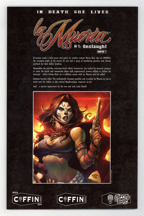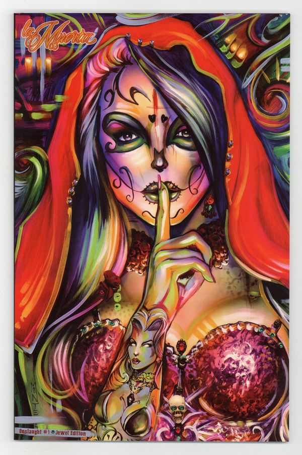 Jewel Edition Variant Cover by Monte Moore. (W) Mike MacLean (A) Joel Gomez. 'Deathocalypse,' an official year long company wide event unfolds here! Maria Diaz stalks the streets as the relentless vigilante La Muerta, seeking vengeance against the criminal underworld. For a time, all was peaceful and quiet in her life - until tonight! Guest appearance by Lady Death!