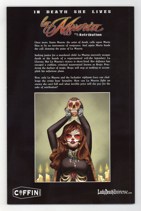 Jewel Edition Variant Cover by Collette Turner - limited to 300 copies. Written by Mike MacLean. Art by Joel Gomez. New Story! New Format! Once more, Santa Muerte, the saint of death, calls upon Maria Diaz to be an instrument of vengeance. And again Maria heeds the call, donning the guise of La Muerta. Seeking justice for a murdered child, La Muerta narrowly escapes death at the hands of a supernatural evil-the legendary La Llorona. But La Muerta's victory is short-lived. Her defiance has enraged a ruthless, criminal mastermind known as Brujo. Practicing the darkest of magic, Brujo will stop at nothing to accomplish his nefarious plans. Now, only La Muerta and the luchador vigilante Loco can challenge the crime boss' brutality. How can La Muerta fight an enemy she can't kill and what terrible price will she pay for the sake of retribution? 32 pages, full color. NOTE: Generic image is of a signed copy, this does not necessarily reflect all copies.