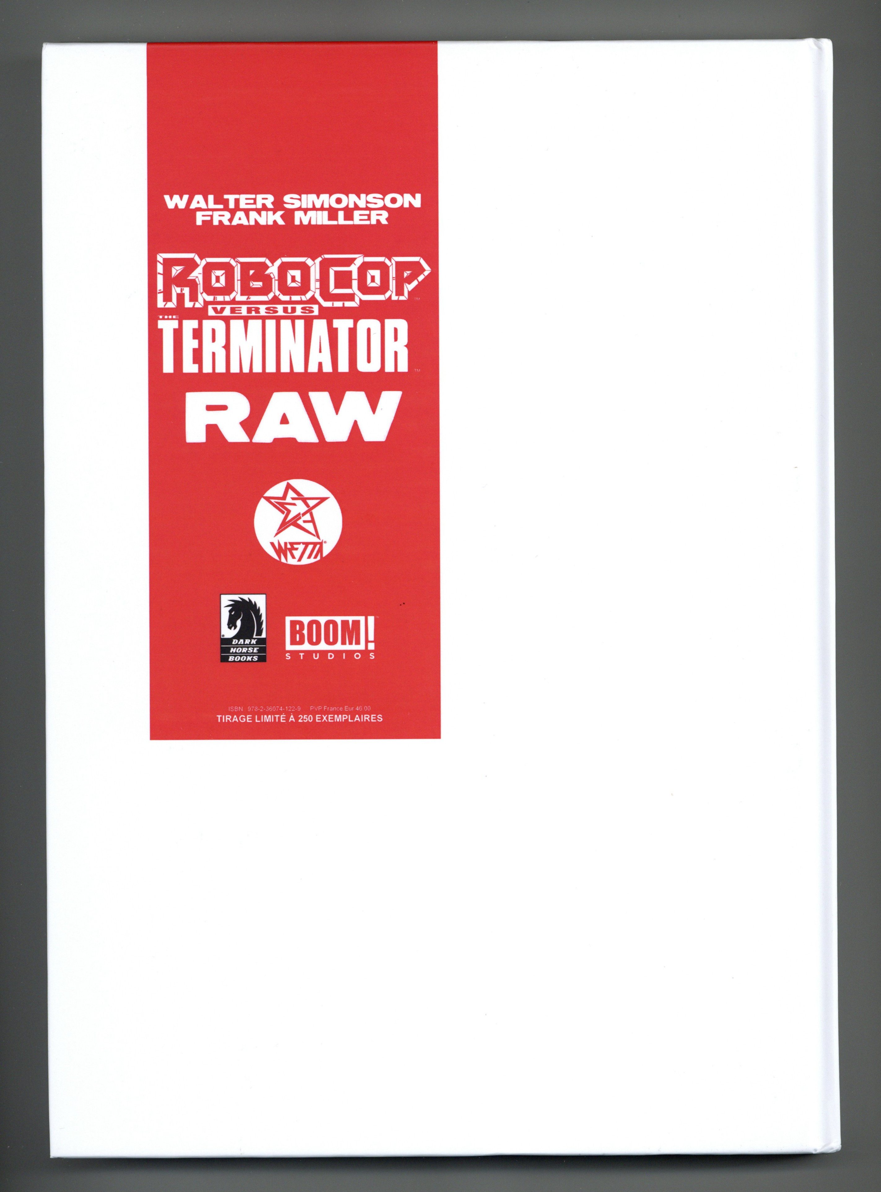 French Edition. RAW Black and White - Limited to 250 copies. Collects RoboCop vs. Terminator (1992) #1-4. Written by Frank Miller. Art and cover by Walter Simonson. Comics' greatest creators pit the supreme machine killer against the ultimate cybernetic cop in one of the most celebrated crossovers ever! When fate reveals that the technology that built RoboCop will lead to the creation of Skynet, Alex Murphy must engage in time-twisting battle against both the murderous computer network and the human resistance fighters out to destroy him! Dark Horse is proud to collect, for the first time ever, Frank Miller and Walter Simonson's classic RoboCop vs. The Terminator in a newly restored "Raw Black and white" hardcover edition! Hardcover, 132 pages, B&W.