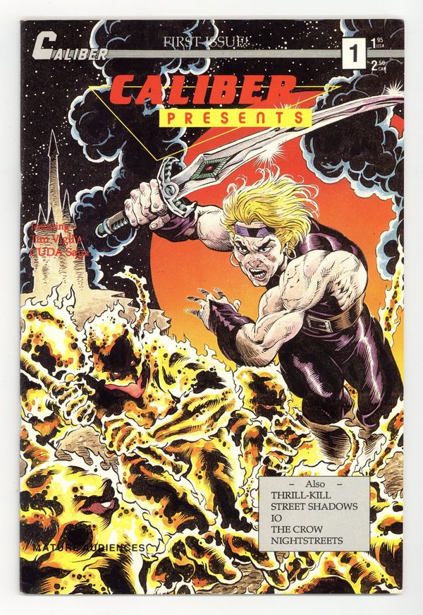 $350.001st appearance of The Crow. Cover by Tim Vigil. Stories and art by James OBarr, Mark Bloodworth, Tim Vigil, Mark Winfrey, Tim Tyler, and Kyle Garrett. Anthology featuring Caliber artists and characters, as well as stand-alone stories. The first-ever appearance of OBarrs The Crow in Inertia, plus another OBarr story, IO; the sword-and-sorcery strip Cuda; a preview of Bloodworths NightStreets series. 48 pages, B&W. Mature readers. Cover price $1.95.