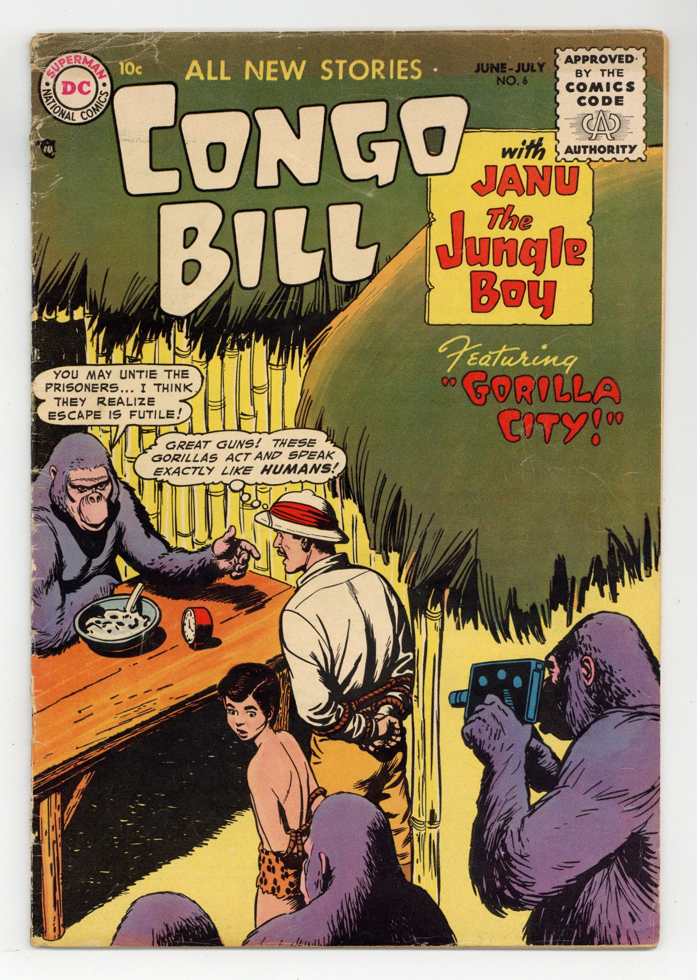 "Gorilla City!" Congo Bill and Janu encounter a village filled with talking gorillas who are actually Martians. "Bombo?the Rage of London!" Bombo the Rogue Elephant goes to London. Also includes: "The Jungle Trolley Car!; "The World's Greatest Hunters"; and "Unseen Dangers of the Jungle." Cover by Nick Cardy. Cover price $0.10.