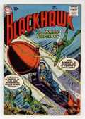 Blackhawk is trapped in a new experimental missile...and someone is drawing him to his doom by radio control! Featuring: 8 page Blackhawk story "The Human Torpedo" written by Dave Wood and drawn by Dick Dillin & Charles Cuidera; 8 page Blackhawk story "The Outcast Blackhawk" written by Dave Wood and drawn by Dick Dillin & Charles Cuidera; 8 page Blackhawk story "The Prisoners of the Black Palace" written by Dave Wood and drawn by Dick Dillin & Charles Cuidera; 1 page text story "Airborne Getaway." Cover by Dick Dillin & Charles Cuidera. Cover price $0.10.