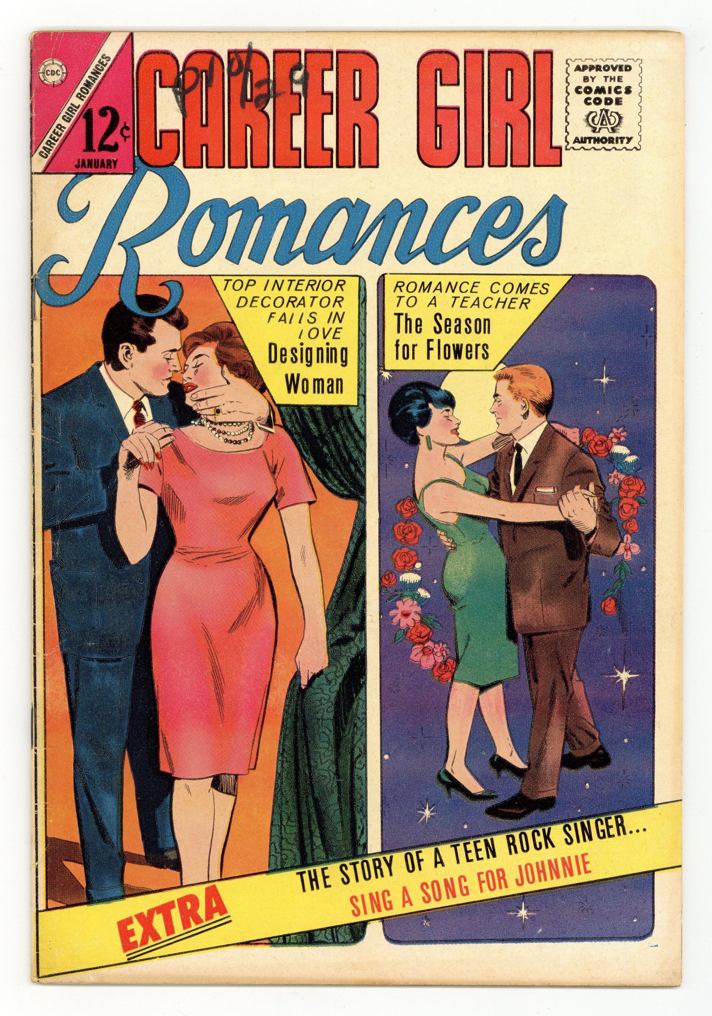Cover by Dick Giordano. Stories and art by Sal Gentile and others. Reflecting the changing times, Charlton's 1960s series focuses on the lives and loves of working women. Teacher Gail is torn between steady George and nerdy new hire Tom. Teen rock star Melody has no time for romance and is desperately lonely, in a story featuring a one-panel cameo by the early-era Beatles. A decorator starts to fall for her handsome, wealthy client Todd, who's all business. The Season for Flowers; The Twenty-first of May; Sing a Song for Johnnie; What a Dinosaur Can Do; Exercise at the Office; Designing Woman. 32 pages, Full Color. Cover price $0.12.