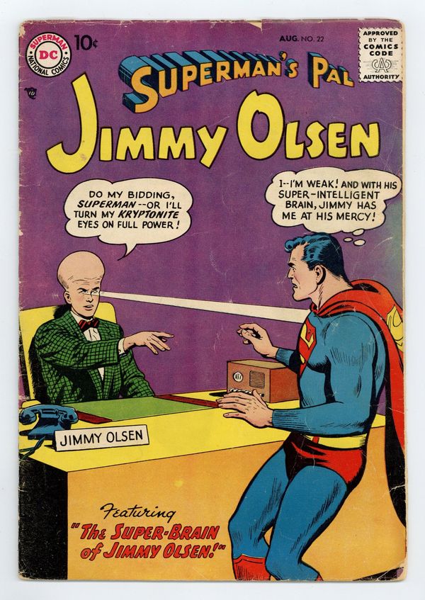 Tags: Superman$18.00Cover pencils by Curt Swan, inks by Ray Burnley. The Mystery of the Millionaire Hoboes; "Hobo Jimmy" Olsen investigates a group of millionaires masquerading as hobos. The Super-Hallucinations; Superman and Jimmy believe a UFO they see is a hallucination. Jerry Jitterbug humor page by Henry Boltinoff. The Super-Brain of Jimmy Olsen; When Jimmy allows Prof. Potter to demonstrate his evolution accelerator on him, he becomes a human from 1,000,000 A.D. who calls himself the Cosmic Brain. Scripts by Otto Binder, pencils by Curt Swan, inks by Ray Burnley. Ollie humor page by Henry Boltinoff. Earn While You Learn! public service announcement, script by Jack Schiff, art by Ruben Moreira. Card Tricks You Can Do article. 36 Pages, Full Color. Cover price $0.10.