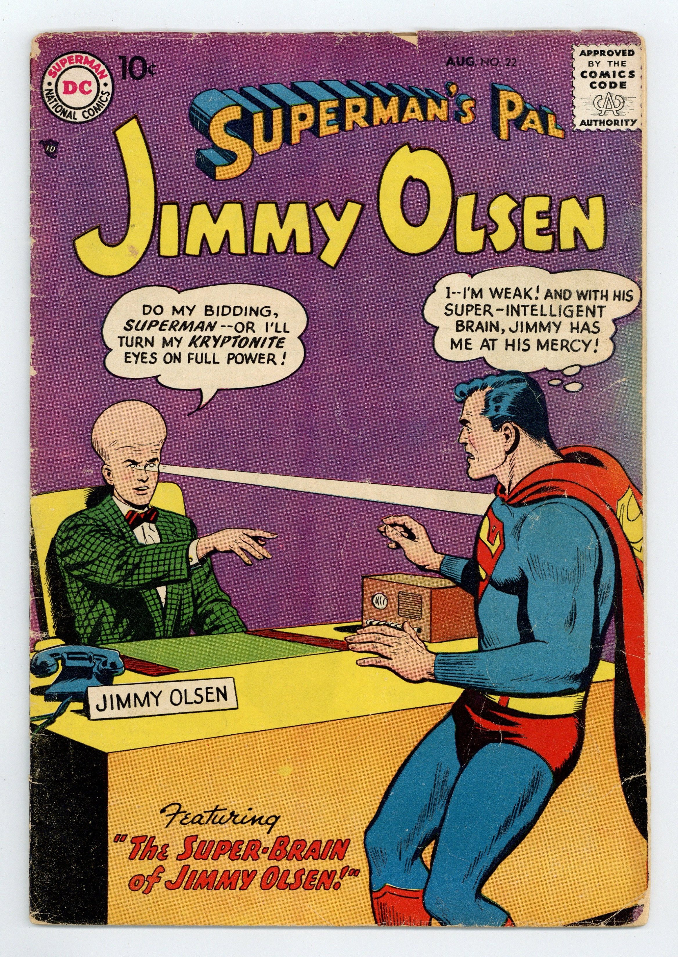 Cover pencils by Curt Swan, inks by Ray Burnley. The Mystery of the Millionaire Hoboes; "Hobo Jimmy" Olsen investigates a group of millionaires masquerading as hobos. The Super-Hallucinations; Superman and Jimmy believe a UFO they see is a hallucination. Jerry Jitterbug humor page by Henry Boltinoff. The Super-Brain of Jimmy Olsen; When Jimmy allows Prof. Potter to demonstrate his evolution accelerator on him, he becomes a human from 1,000,000 A.D. who calls himself the Cosmic Brain. Scripts by Otto Binder, pencils by Curt Swan, inks by Ray Burnley. Ollie humor page by Henry Boltinoff. Earn While You Learn! public service announcement, script by Jack Schiff, art by Ruben Moreira. Card Tricks You Can Do article. 36 Pages, Full Color. Cover price $0.10.