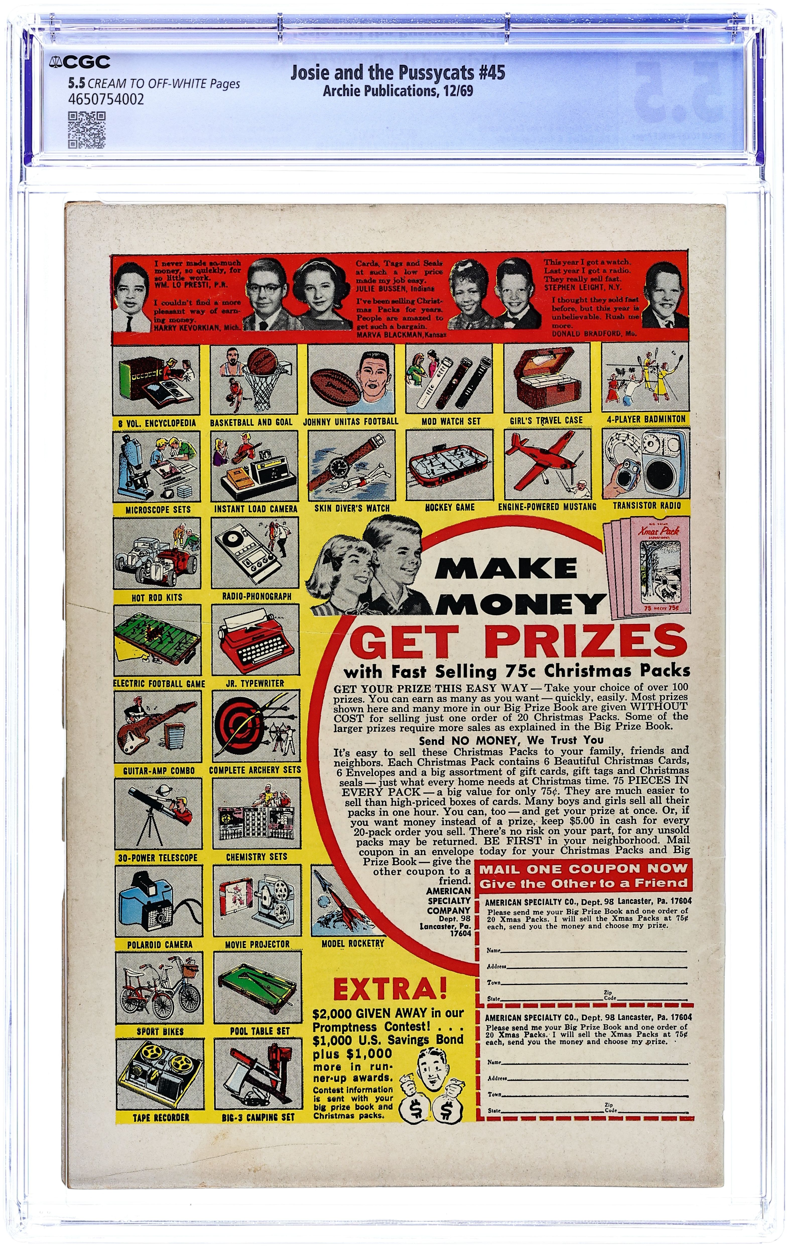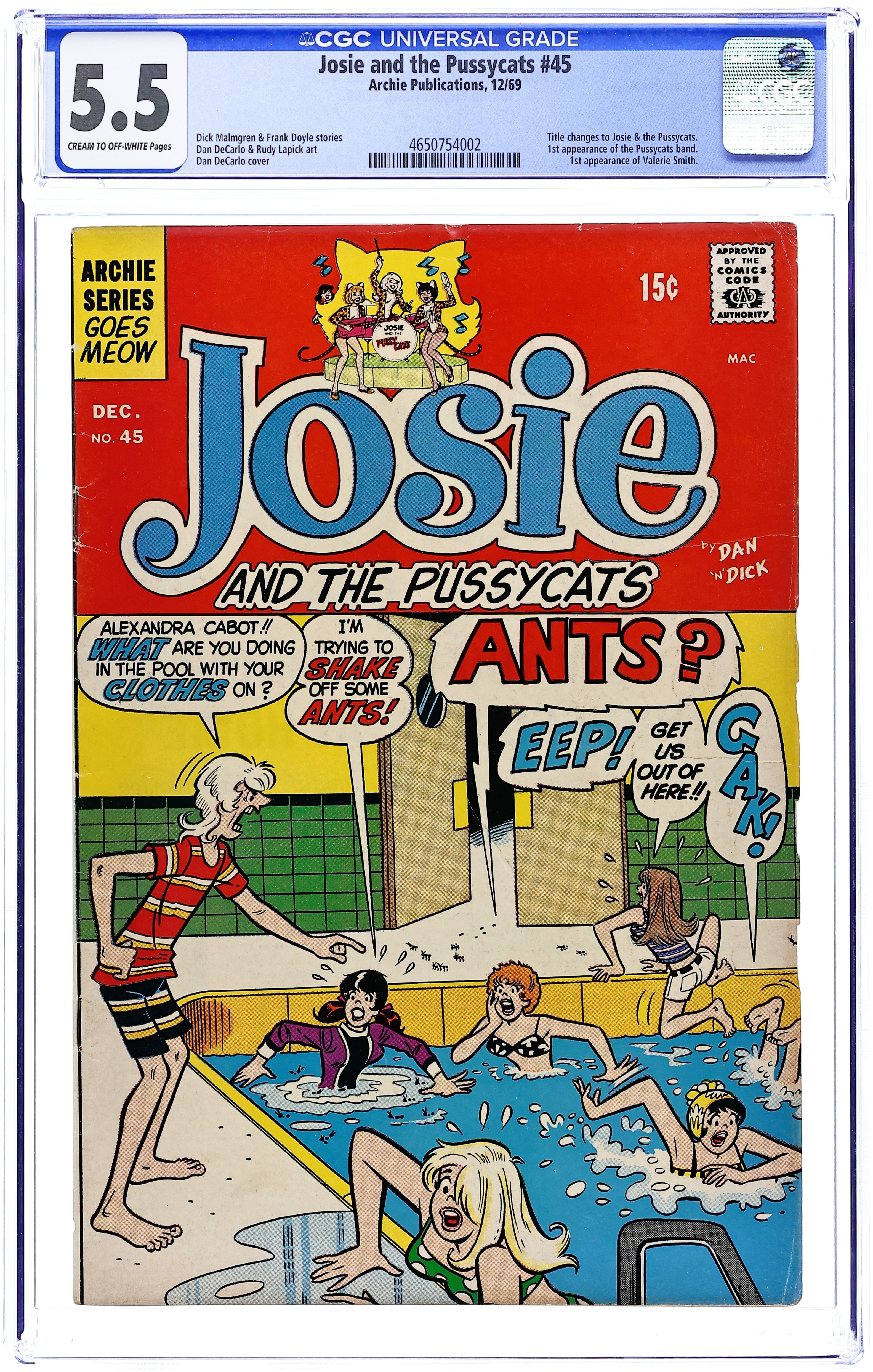 Cover pencils by Dan DeCarlo. Decisions Decisions, script by Dick Malmgren; Alexandra refuses to join Josie and Melody's new band, the Pussycats, unless they change the name to "Alexandra's Cool Time Cats"; First appearance of Valerie; First appearance of the Pussycats musical group. Pussy Footing, script by Dick Malmgren; Josie, Melody and Valerie play their first concert in their new Pussycats costumes. Off To a Good Start, script by Frank Doyle; Alexandra tries to use her powers of mind control to get Alan M. away from Josie. Pencils by Dan DeCarlo, inks by Rudy Lapick. House ad for the new title "Everything's Archie." 36 pgs. $0.15. Cover price $0.15.