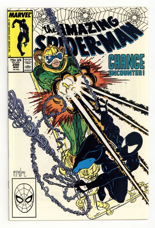 Tags: Marvel Legacy Numbering: Amazing Spider-Man (part 298), Spider-Man$82.00Direct Edition. "Chance Encounter!" Part 1 of 2. Script by David Michelinie. Pencils by Todd McFarlane. Inks by Bob McLeod. Cover by Todd McFarlane. Chance is back in business and working a new job for the Life Foundation! The clandestine organization wants Chance to steal an arms shipment coming into the west side docks! That should be a piece of cake for the high-flying mercenary! However, the Daily Bugle dispatches an undercover photographer to observe the delivery! And beneath the moonlit sky, fireworks explode when Chance and the Amazing Spider-Man throw down on the docks! First appearance (and cameo on the last page) by Eddie Brock (aka Venom). First appearance of Carlton Drake of the Life Foundation. Cameo appearances by Mary Jane Watson, Joy Mercado, and Joe Robertson. (Notes: Chance previously appeared in Web of Spider-Man 15. This issue begins Todd McFarlane's 2-year run as the penciler of the Amazing Spider-Man series.) 36 pages. Cover price $0.75.