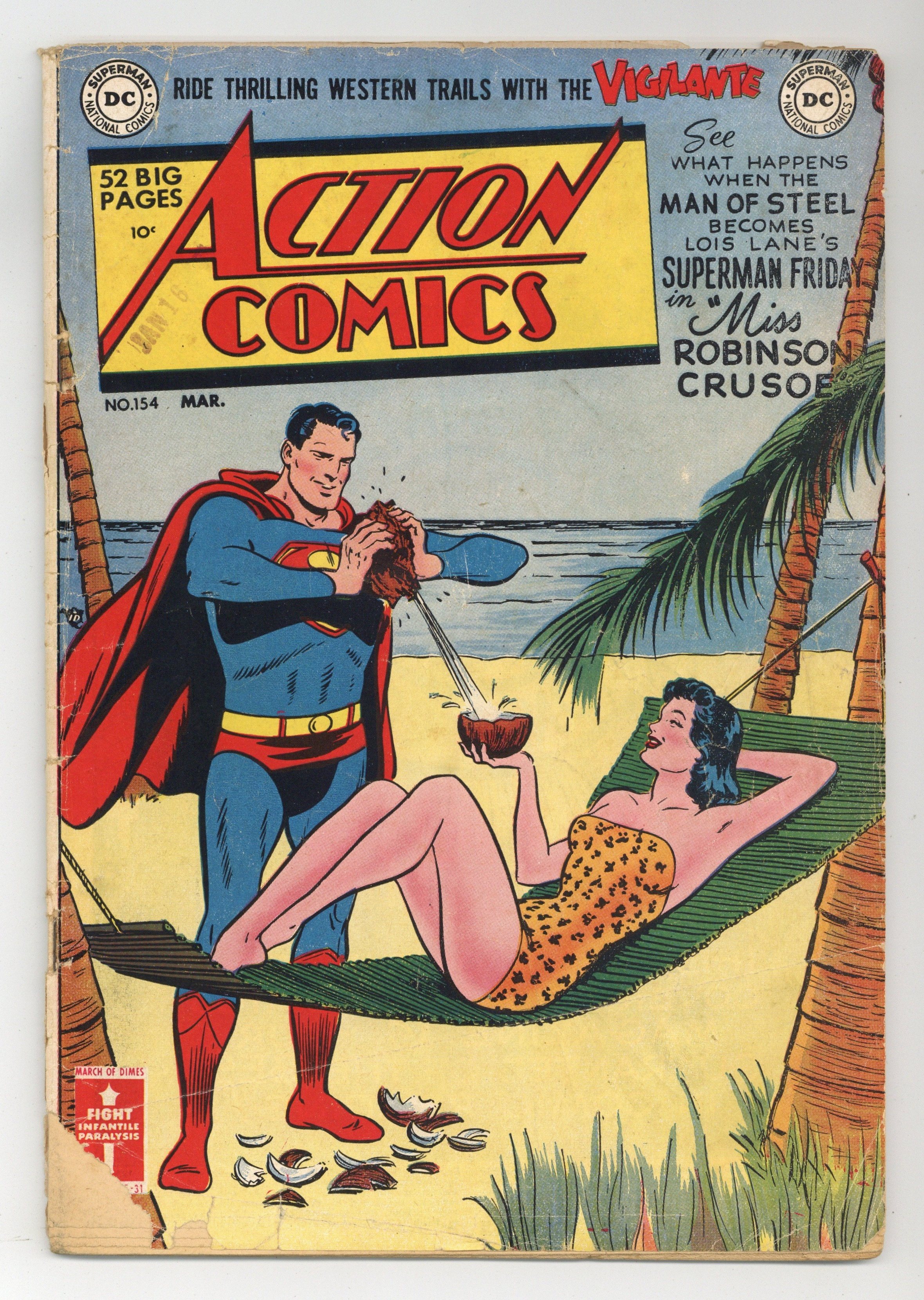 Cover art by Win Mortimer. Miss Robinson Crusoe starring Superman, art by Al Plastino. The Pest of the Planeteers starring Tommy Tomorrow, pencils by Curt Swan, inks by John Fischetti. Scores One for the Handicapped! starring Buzzy, script by Jack Schiff, art by Win Mortimer. The Octopus League starring Congo Bill, art by Ed Smalle. The Covered Wagon Cavalcade starring Vigilante, art by Bob Brown. 52 Pages, Full Color. $.10 Cover price $0.10.