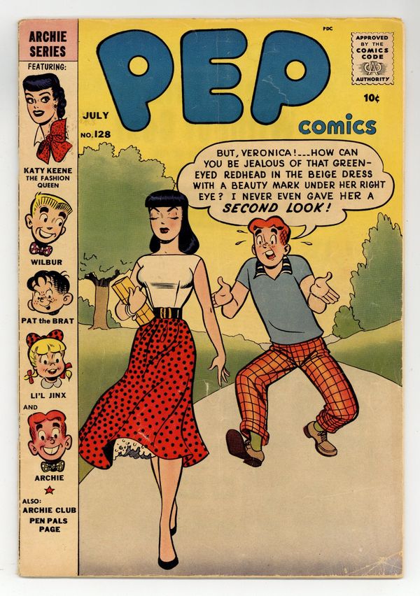 "Lore and Order"; Mr. Weatherbee makes Archie and Reggie hallway monitors. "It's a Bet"; Dilton and Archie make some bets and Dilton comes out ahead. Untitled Katy Keene story, art by Bill Woggon; Sis dreams she takes a rocket ship ride to an outer space candy land. "If Looks Could Kill"; Betty takes Jughead's advice on how to get out of a date and it backfires. "A Cheerful Earful," script and art by Joe Edwards; Laurie has a sprained ankle and Linda stops by to tell her how much attention Wilbur is getting from all the other girls. "In Its Proper Place," script and art by Joe Edwards; Wilbur asks Linda over to help him hang a picture of Laurie. Archie Club News. "The Invisible Man," script and art by Joe Edwards; Li'l Jinx turns Charley invisible with a magic wand. 36 pgs., full color. Cover price $0.10.