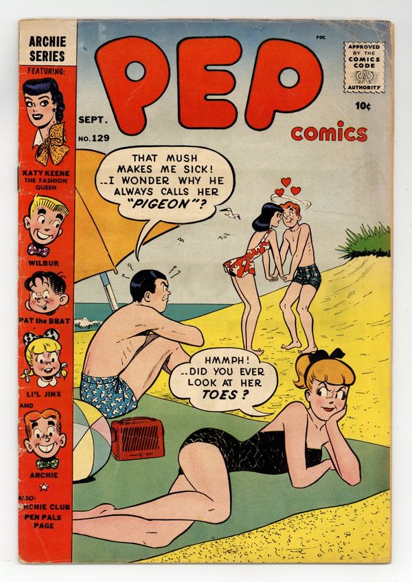 Cover pencils by Harry Lucey, inks by Martin Epp. "Dog Daze," script by Frank Doyle, pencils by Harry Lucey, inks by Martin Epp; The students find a stray dog but Mr. Weatherbee makes them leave it outside in the rain. "Midnight Shoo Shoo" -page story, script by Jack Mendelsohn, art by Tom Moore; Mr. Lodge objects to Archie taking the morning paper after staying up with Veronica all night. "Mask Me Another," pencils by Bill Vigoda; Jughead is scaring everyone with a rubber mask he purchased. "The New Look," script by Bill Woggon, art by Hazel Marten (as Bill Woggon); Katy is mystified when her latest outfit causes everyone to laugh at her. "Novel Approach," pencils by Dan DeCarlo, inks by Rudy Lapick; Betty plants suspicion in Veronica's mind, hoping she'll break up with Archie so Betty can move in. "Finders Keepers" one-page story, script and art by Joe Edwards; Wilbur dropped a coin and Slats finds it. One-page Pat the Brat story. "You're the Judge," script and art by Joe Edwards; The kids hold a flower show and want Jinx's father to judge. 36 pgs., full color. Cover price $0.10.