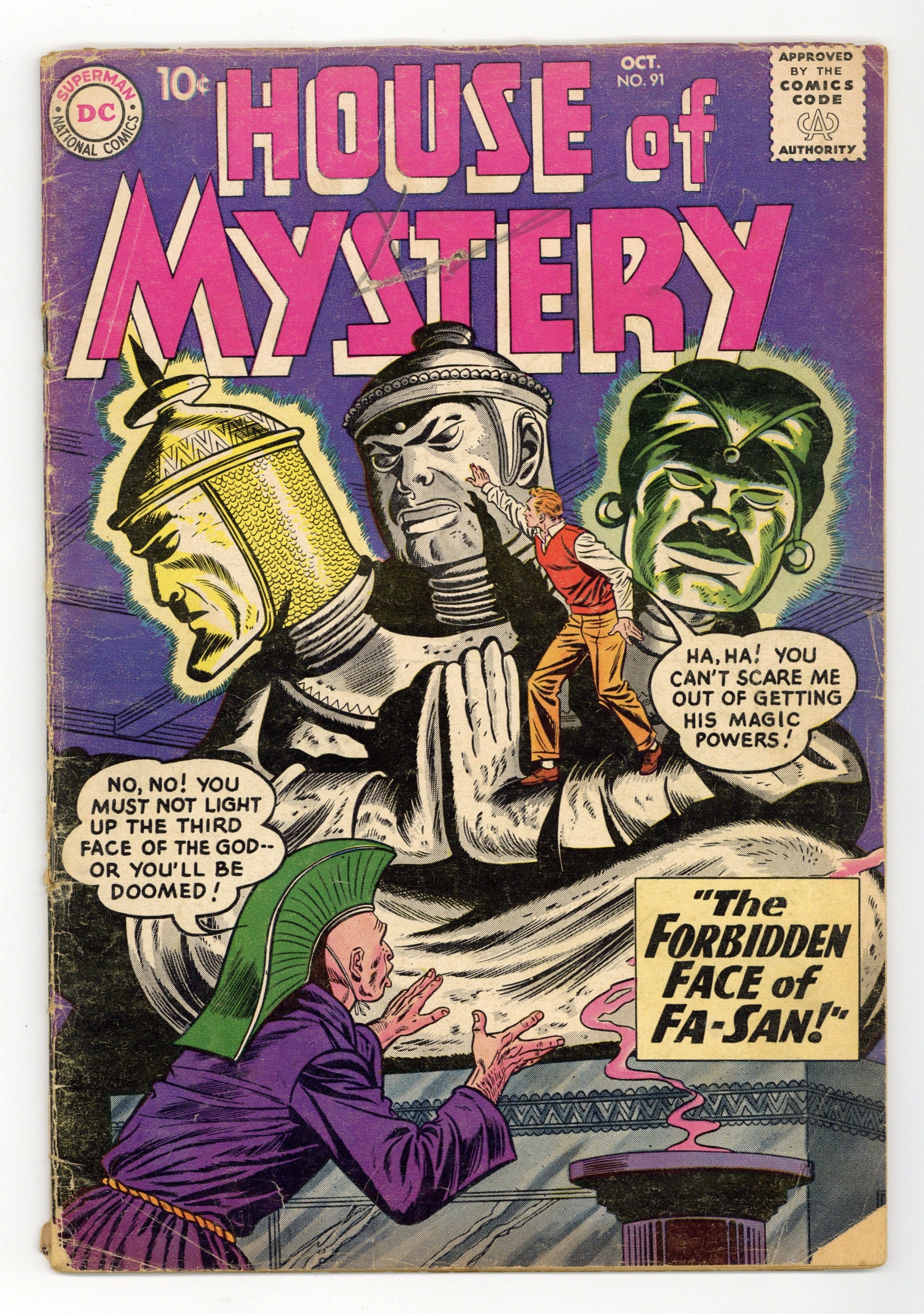 Cover pencils by Dick Dillin, inks by Sheldon Moldoff. "The Riddle of the Alien Satellite," art by George Roussos; A glowing satellite lands on Earth, emitting rays that make everything around it shrink. "It's Fun to Learn!" public service announcement, script by Jack Schiff, art by Bernard Baily; Ted teaches Billy and Steve about levers while they are cleaning up a vacant lot, touting the value of science class. One-page Dr. Floogle story by Henry Boltinoff. "The Deadly Safaris," art by Bernard Baily; A swindler uses three enchanted artifacts to bring people under his control and force them to locate a fantastic lost treasure for him. "Death Knock!" half-page filler, script and art by Mort Drucker. Half-page Doctor Rocket story by Henry Boltinoff. "The Vengeful Victim" text story. "The Forbidden Face of Fa-San!", art by Bill Ely; Three treasure hunters encounter a strange three-headed idol; Two of the heads bring good fortune, but the third punishes the greedy hunter who tries to cheat his partners. 36 Pages, Full Color. Cover price $0.10.