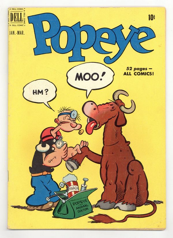 Cover art by Bud Sagendorf. Scripts and art by Bud Sagendorf. Popeye's Workshop activity page. Animal Talk!; A mad scientist tries to turn Popeye into a dog, but instead Popeye gains the ability to talk to animals; Animals then come from miles around to seek Popeye's help with their problems. Train Time!; Popeye has to find out why no trains are running on his railroad. The Boom Brothers' Last Boom!!; Ham Gravy takes on the job of a local sheriff to capture the Boom Brothers. Bugtown Capers text story. The Elder Egg, script and art by W. Y. Ferrol; Wimpy finds a giant egg. How to Draw Wimpy activity. Untitled story; Popeye keeps sending Olive live animals from his long sea voyage. Based on the classic cartoon and comic strip character. 52 pages, full color. Cover price $0.10.