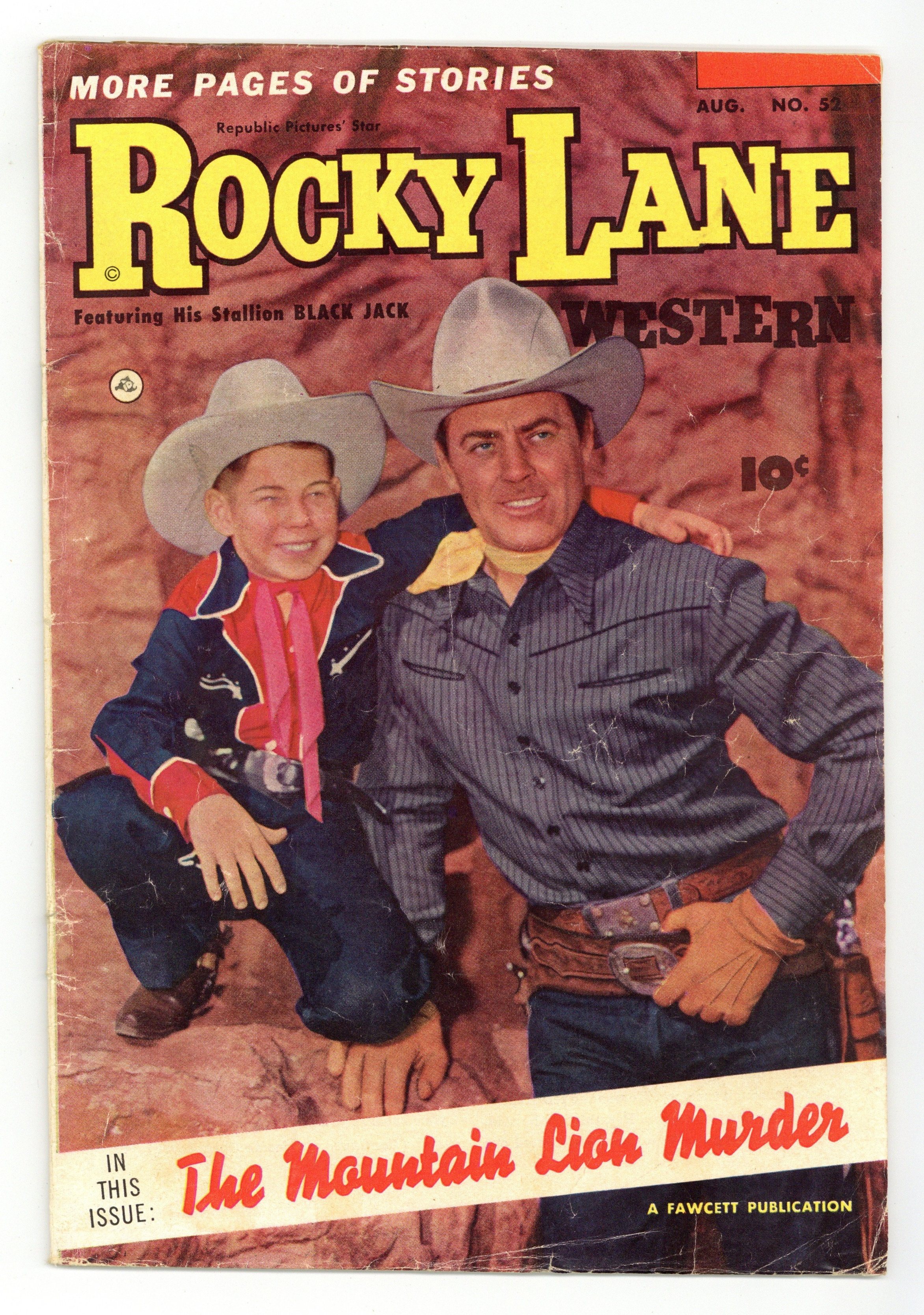 Published Aug 1953 by Fawcett/Charlton.$18.00Stories and art by Ralph Carlson and Howard Boughner. Movie cowboy Allan "Rocky" Lane roams the West with a yen for justice. Rocky tries to tame a Western town when a cattle drive comes through, making the place as wild as a future spring break, only with horses and guns. A beautiful woman causes strife in a small town, but that's as nothing to a woman scorned. Vengeful outlaw Hank plots to get even with Rocky in the town of Wheel Rim, where guns are banned. Peaceful Pete; The Green-Eyed Monster; Sagebrush; The Town Tamer; Gopherface; Bronko Betsy; Dee Dickens: The Mighty Masseur; The Mountain Lion Murder. 32 pages, Full Color. Cover price $0.10.