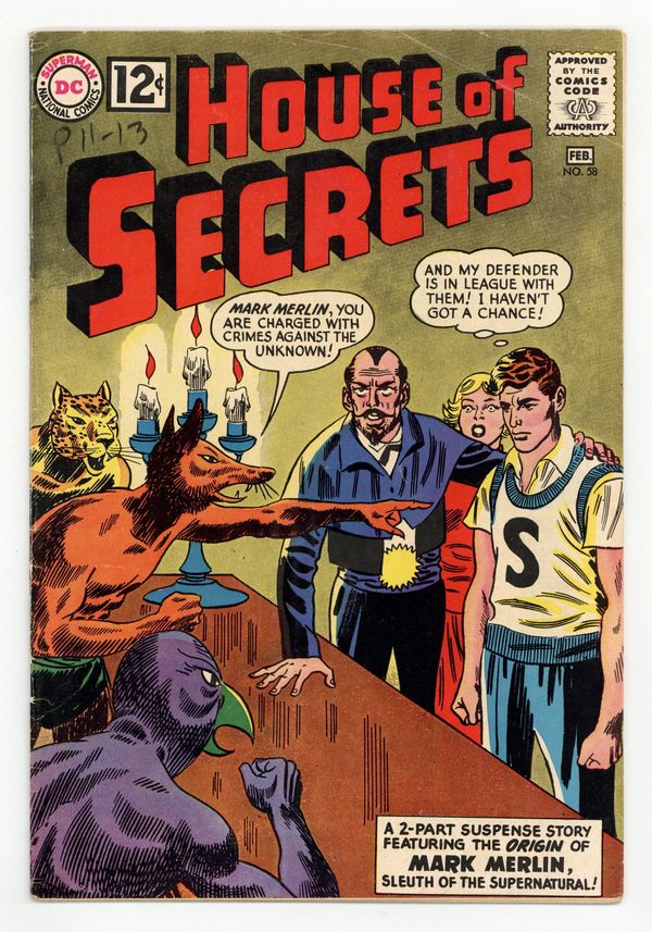 $19.25Cover pencils by Mort Meskin, inks by George Roussos. "Trial by Fire," pencils by Mort Meskin, inks by George Roussos; Mark Merlin relates the story of his first case: how he solved the murder of his father, a stage magician. "Touchdown for Picasso!" public service announcement, script by Jack Schiff, art by Sheldon Moldoff; Stan is surprised to learn that his favorite football player also enjoys the fine arts. Ads for Superman, Batman and Robin, and Strange Sports Stories. One-page The Magic Genie story by Henry Boltinoff. "Time Bomb from 1500 A.D.", art by Paul Parker; Journalist Hal Breese discovers a buried weapon invented by Leonardo da Vinci, but it is stolen and he must find a way to keep it from being used against the world. Rudolph the Red-Nosed Reindeer comic book ad. One-page Varsity Vic story by Henry Boltinoff. Letter from fanzine publisher Ronn Foss. "The Wondrous Witch's Cauldron," art by Lee Elias; A witch's cauldron that brings its owner fame, fortune, and long life passes from owner to owner. 36 Pages, Full Color. Cover price $0.12.