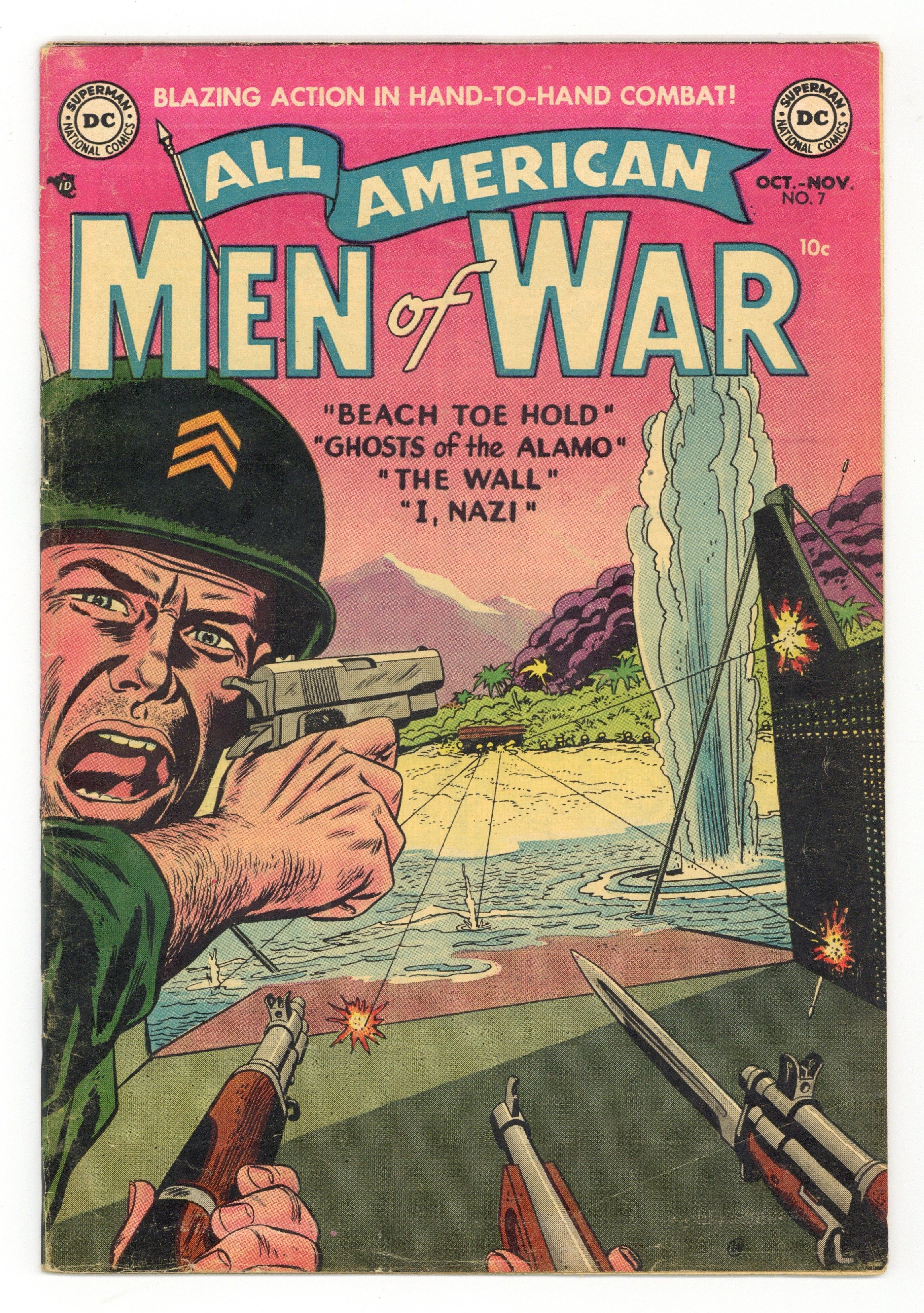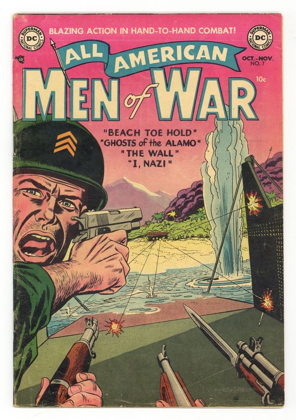 Edited by Whitney Ellsworth. Cover by Irv Novick. Stories by Robert Kanigher, Irv Novick, Joe Giella, Bill Woolfolk, Gene Colan, Henry Boltinoff, Ed Herron, Jerry Grandenetti, Sy Barry, Ed Herron, and Bernard Sachs. Adventure tales of war and the military, including some humor—go into combat with All American Men of War! 36 Pages, Full Color. Cover price $0.10.