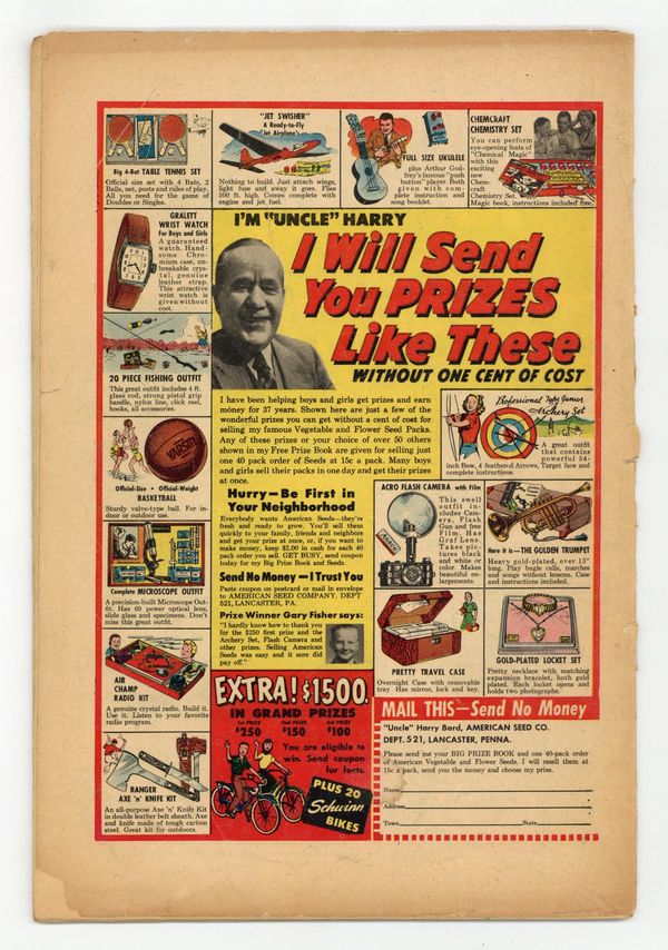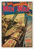 "Torpedo Track" (art--pencils only?--by Carmine Infantino), "Battle Scout," "Unlucky Seven," and "Fighting Duck!" Edited by Whitney Ellsworth and Robert Kanigher. Cover by Jerry Grandenetti. Stories by Robert Kanigher, Irv Novick, Causin, Sam Burlockoff, Joe Giella, Arthur Peddy, David Kahn, Ross Andru, and Mike Esposito. Adventure tales of war and the military, including some humor—go into combat with All American Men of War! 36 Pages, Full Color. Cover price $0.10.