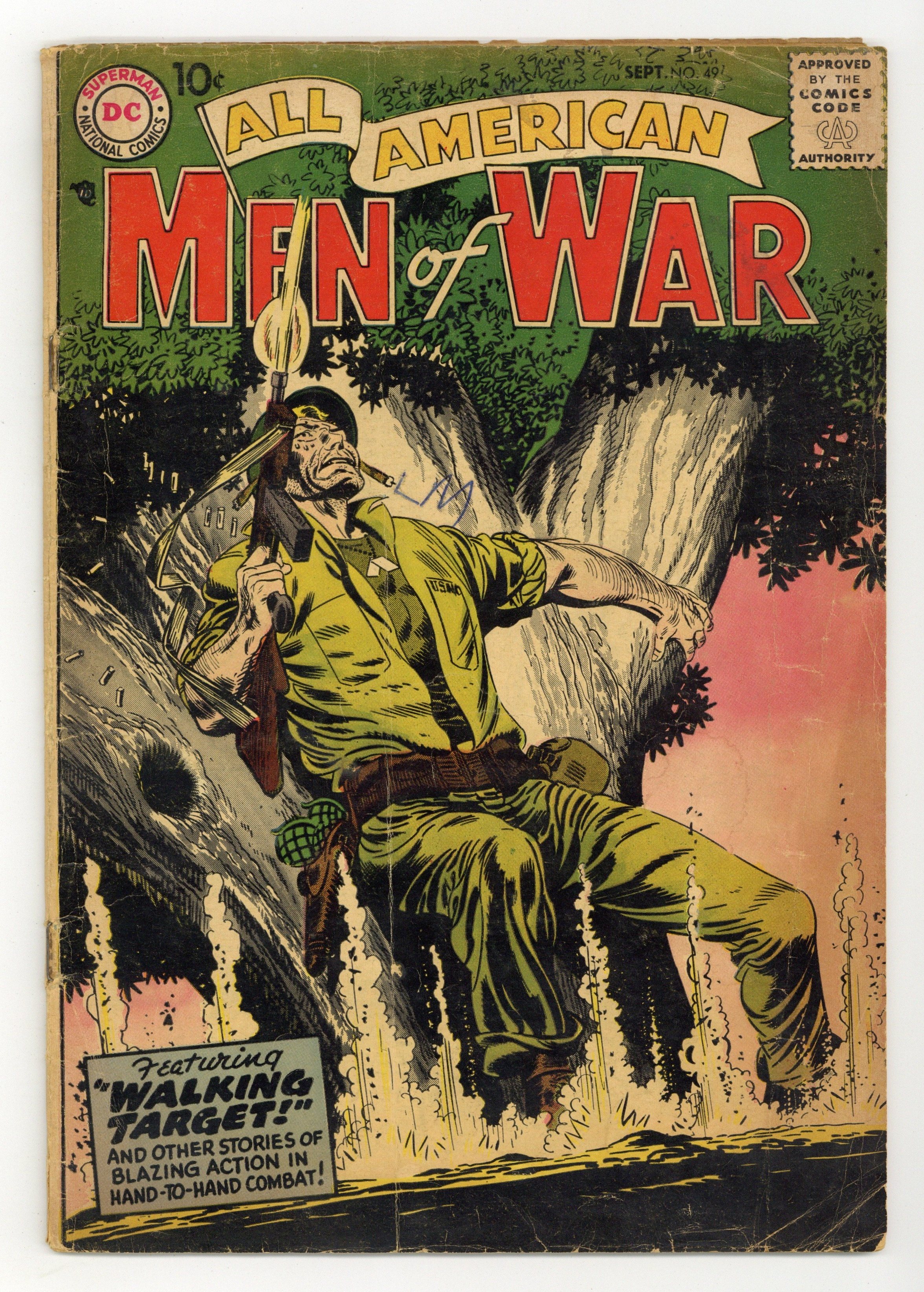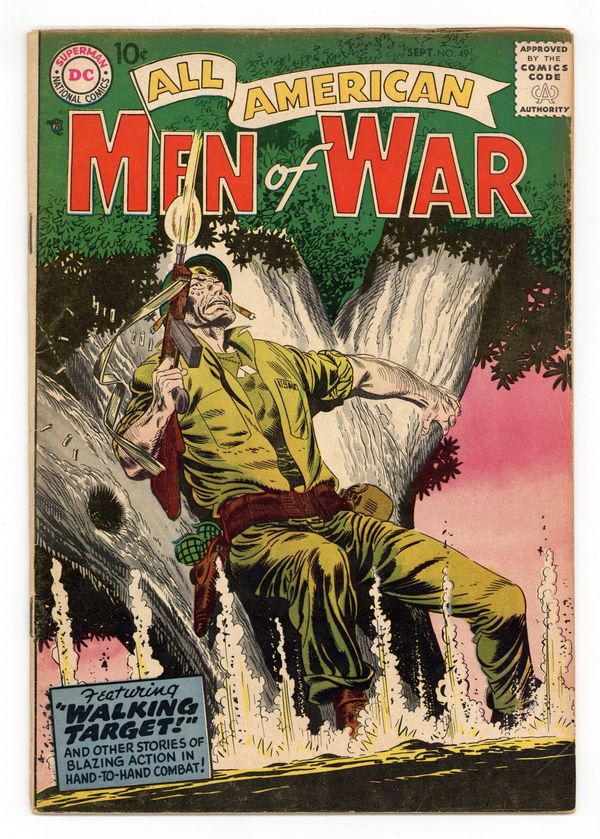 Edited by Whitney Ellsworth and Robert Kanigher. Cover by Jerry Grandenetti. Stories by Robert Kanigher, Ross Andru, Mike Esposito, Ed Herron, Joe Kubert, Julius Schwartz, Morris Waldinger, Tom Nicolisi, Bob Haney, and Jack Abel. Adventure tales of war and the military, including some humor—go into combat with All American Men of War! Article on Aviation Pioneer Glenn Curtiss. 36 Pages, Full Color. Cover price $0.10.