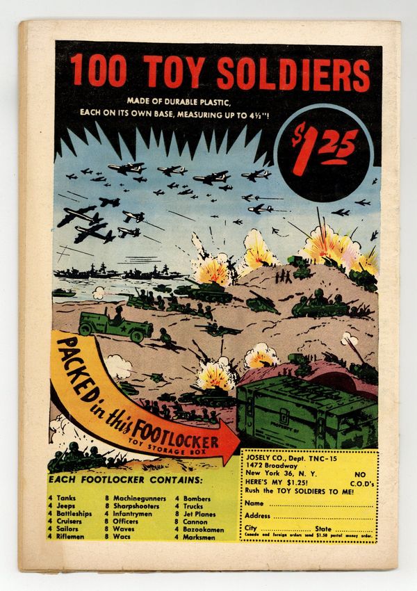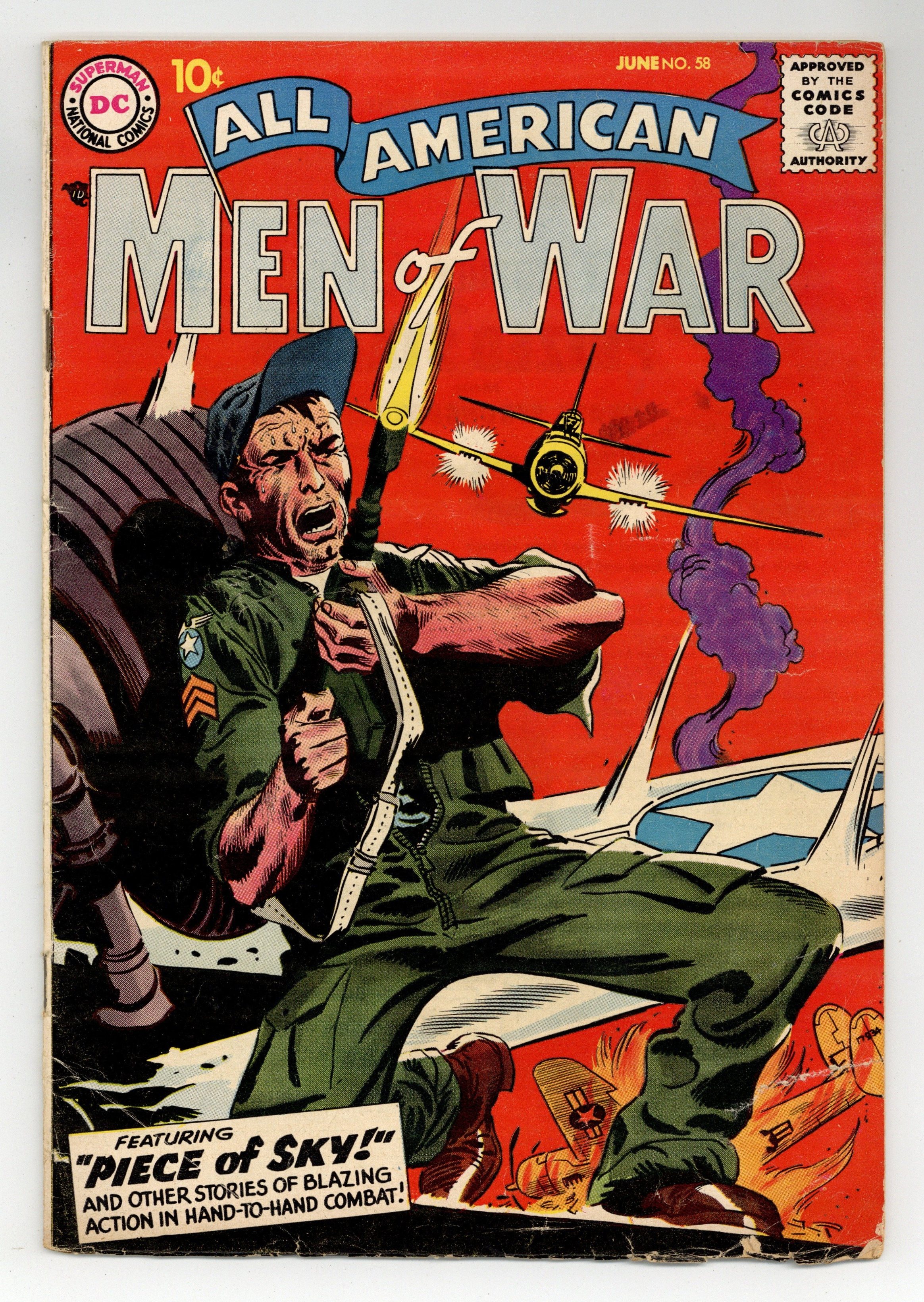 "A Piece of Sky," "Frogman Pool" (art by Russ Heath), "Battlefield Window" (art by Mort Drucker), and "Count on Me" (art by John Severin). Edited by Whitney Ellsworth. Cover by Joe Kubert. Stories by Robert Kanigher, Ross Andru, Mike Esposito, Morris Waldinger, Tom Nicolisi, Bill Finger, Russ Heath, Bob Haney, Mort Drucker, Bob Haney, and Severin. Adventure tales of war and the military, including some humor—go into combat with All American Men of War! 36 Pages, Full Color. Cover price $0.10.