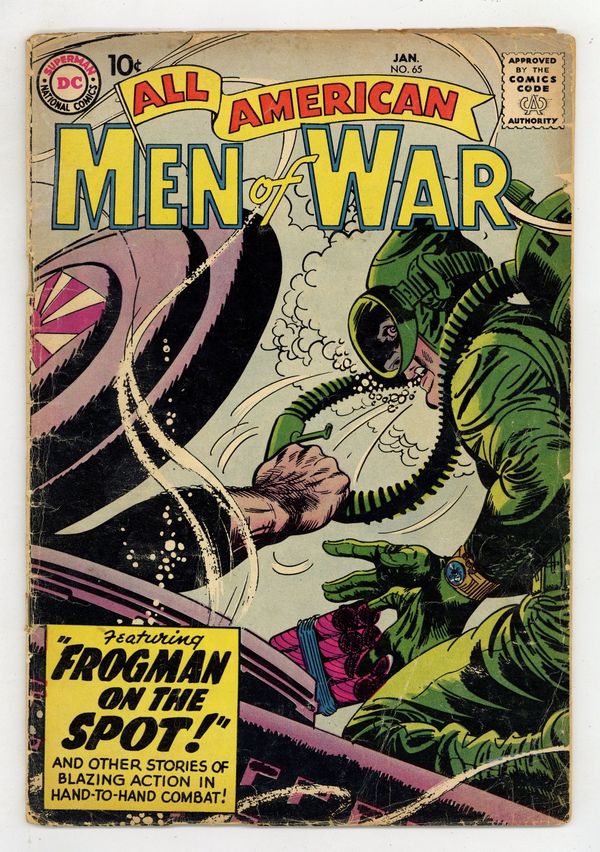 Edited by Whitney Ellsworth and Robert Kanigher. Cover by Jerry Grandenetti. Stories by Bob Haney, Jerry Grandenetti, Morris Waldinger, Tom Nicolisi, Mort Drucker, Joe Kubert, and Bob Stuart. Adventure tales of war and the military, including some humor—go into combat with All American Men of War! 36 Pages, Full Color. Cover price $0.10.