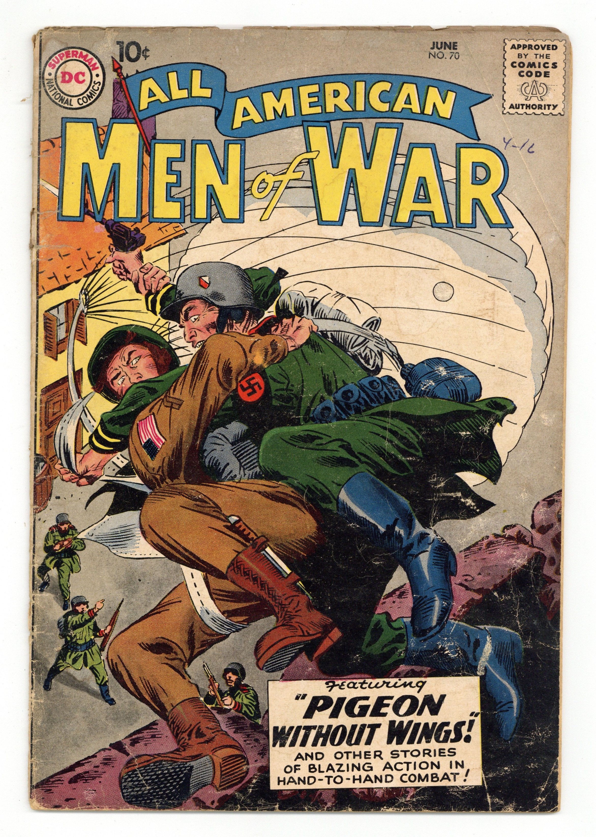 Edited by Robert Kanigher. Cover by Joe Kubert. Stories by Robert Kanigher, Irv Novick, Bob Haney, Jerry Grandenetti, Morris Waldinger, Tom Nicolisi, Bob Haney, and Jack Abel. Adventure tales of war and the military, including some humor—go into combat with All American Men of War! 36 Pages, Full Color. Cover price $0.10.