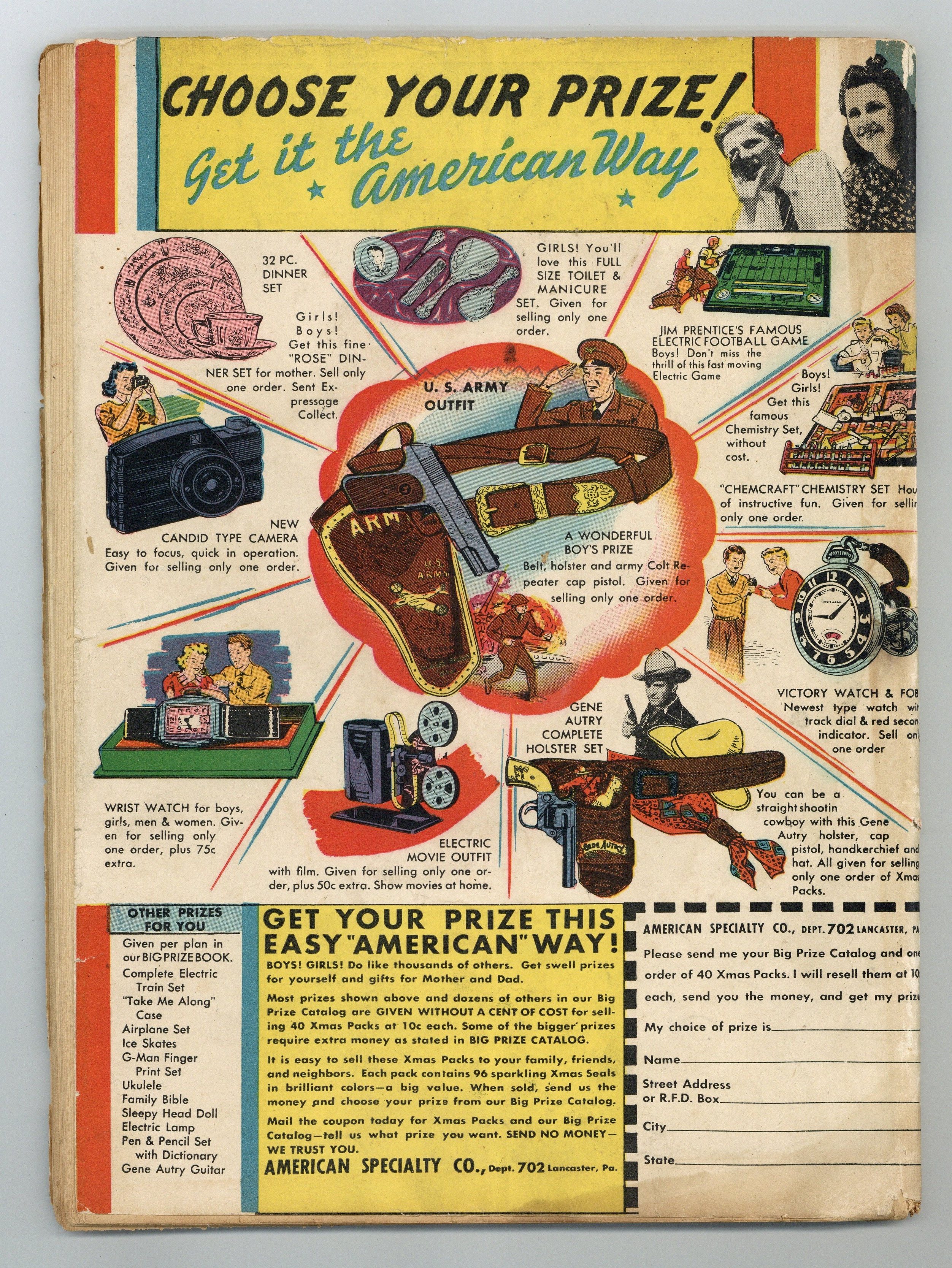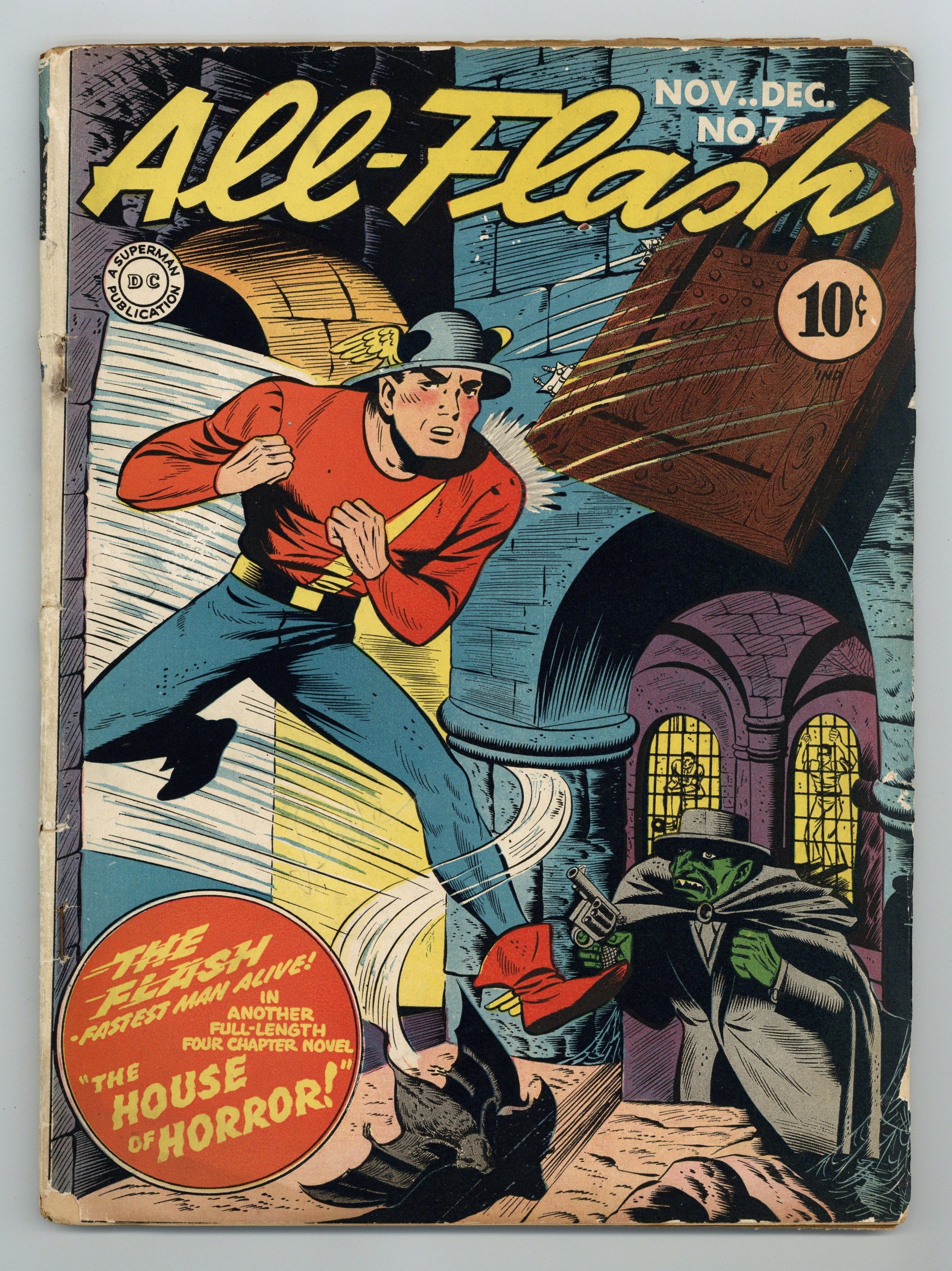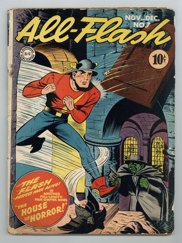 Written by Gardner F. Fox. Art and cover by Harry Tschida. The Flash comes face to face with a mystery writer who not only writes stories, but acts them out in order to make his stories more realistic. Inviting several of his actor friends to help out and scare Jay and Joan, the writer doesn't realize that real crooks have made their way onto the scene. Sweet Adeline humor story by Art Helfant. Grumman-F4F-3 aviation fact page by Falcon Mathieu. Hop Harrigan text story by Evelyn Gaines. 68 Pages, Full Color. Cover price $0.10.