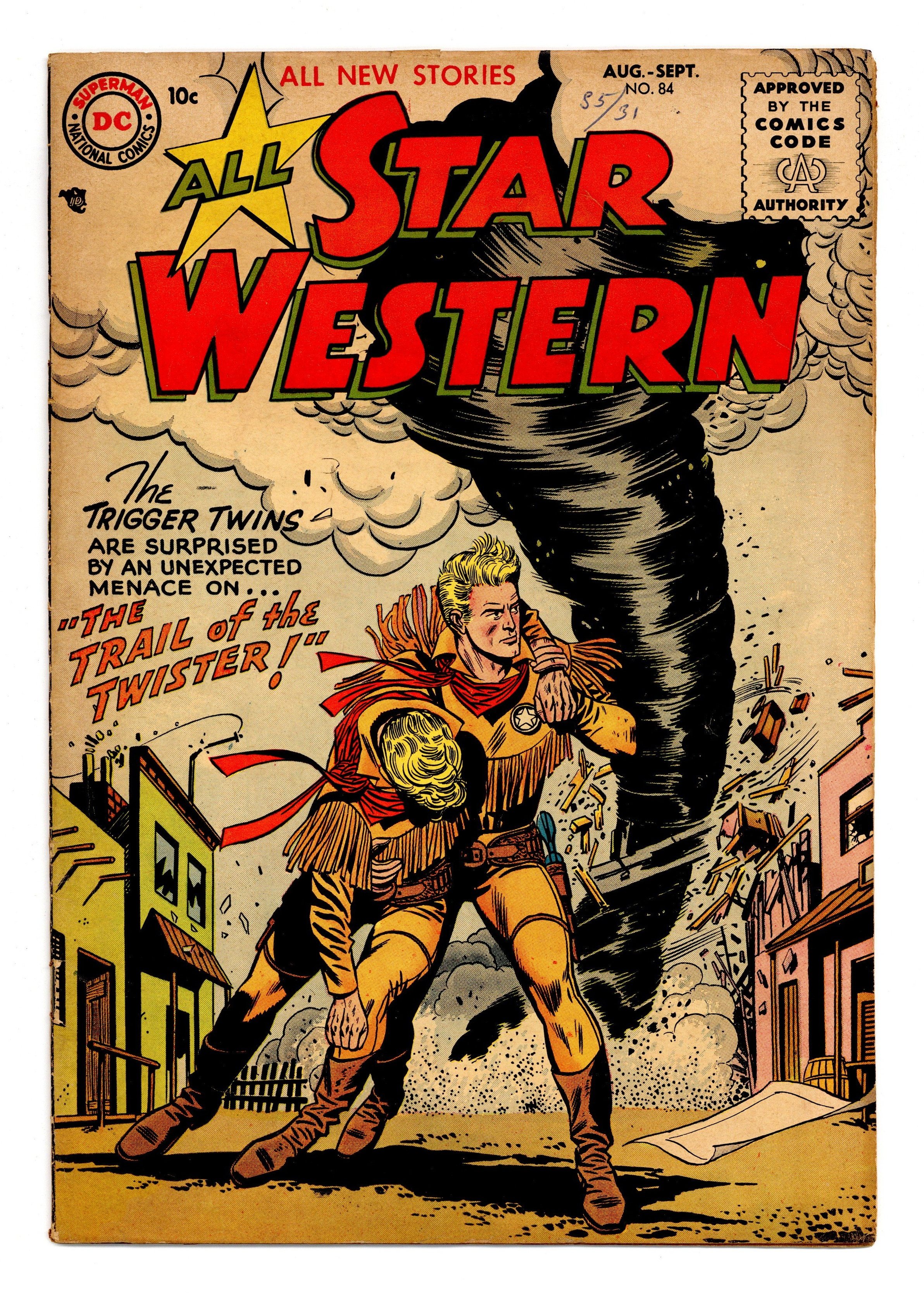 Edited by Julius Schwartz. Cover by Gil Kane and Joe Giella. Written by Lee Goldsmith, Ed Herron, John Broome and Robert Kanigher. Art by Ross Andru, Jerry Grandenetti, Howard Sherman, Gil Kane, Mike Esposito and Sy Barry. The Trigger Twins are surprised by an unexpected menace on..."The Trail of the Twisters!" by Lee Goldsmith, Ross Andru and Mike Esposito. Also in this issue: Strong Bow in "The Moccasins That Won a War!" by Ed Herron and Jerry Grandenetti; Foley of the Fighting 5th in "Threat of the Aztec Athletes!" by John Broome and Howard Sherman; and Johnny Thunder in "The Surprise Sheriff!" by Robert Kanigher, Gil Kane and Sy Barry. Plus: Curious Names of Western Mines! half-pager; 1-pager "Indian Pipe Ritual!"; 1-pager "Social Customs of the Mohave Indians!"; and 2-page article "Prairie Town"! 32 pages, full color. Cover price $0.10.
