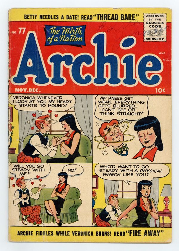 "Thread Bare"; Betty tries every trick she can think of to sew patches on Archie's clothes for the "Patch Hop," but Veronica still wins, without lifting a finger. Archie's Christmas Stocking ad. Archie's Pals 'n' Gals ad. "Fire Away," pencils by Harry Lucey (?); Archie invents a fire alarm and gives it to Mr. Lodge; When Mr. Lodge is entertaining several wealthy industrialists, Archie decides it would be a good time to test the alarm, leading to the usual chaos. "Thinkāor Thwim," pencils by Bill Vigoda (?);Betty's cabin across the lake from Veronica doesn't have any grass for a lawn; Reggie gives orders to Archie and Jughead to take equipment over on a rowboat; Included is a lawn roller, which is empty and is supposed to be filled after it's taken across. "Bob Bob Bopping Along"; Archie, Betty, and Reggie go to a carnival sideshow, where they describe the acts in hipster slang. "The Music Menace"; Archie is elected president of the Music Appreciation Class and is told by the instructor to bring some records for the class to listen to. "Ain't Misbehaving!"; Archie decides the only way he can keep out of trouble at the beach is to just stay on his blanket all day. Wilbur Comics ad. "Clothes Call"; Jughead is staying at Archie's house while his parents are on vacation; He keeps borrowing Archie's clothes. "There Auto Be a Law!"; Veronica's family gets a new car; Archie decides he can teach Veronica how to drive. "Dollars and Lots of Sense"; While looking for Reggie, Archie discovers that Reggie owes money to almost everyone in town. 36 pgs., full color. Cover price $0.10.