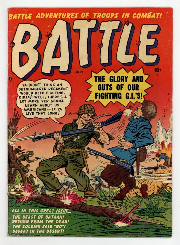 Defeat in the Desert starring German Field Marshall Erwin Rommel. The Soldier Said, 'No', art by Cal Massey. Battle Stations text story. The Beast of Bataan, art by Manny Stallman. Return from the Dead. 32 pgs. $0.10. Cover price $0.10.