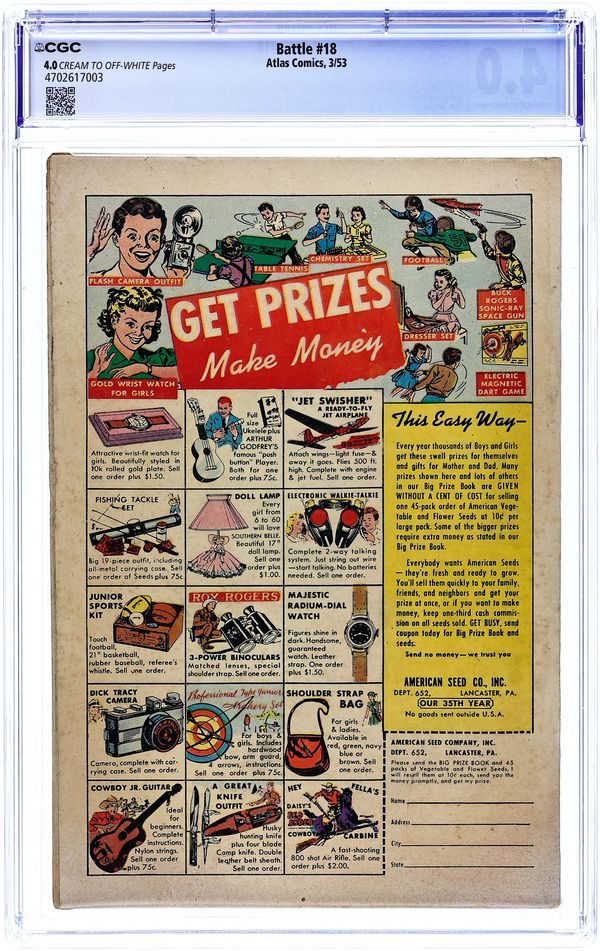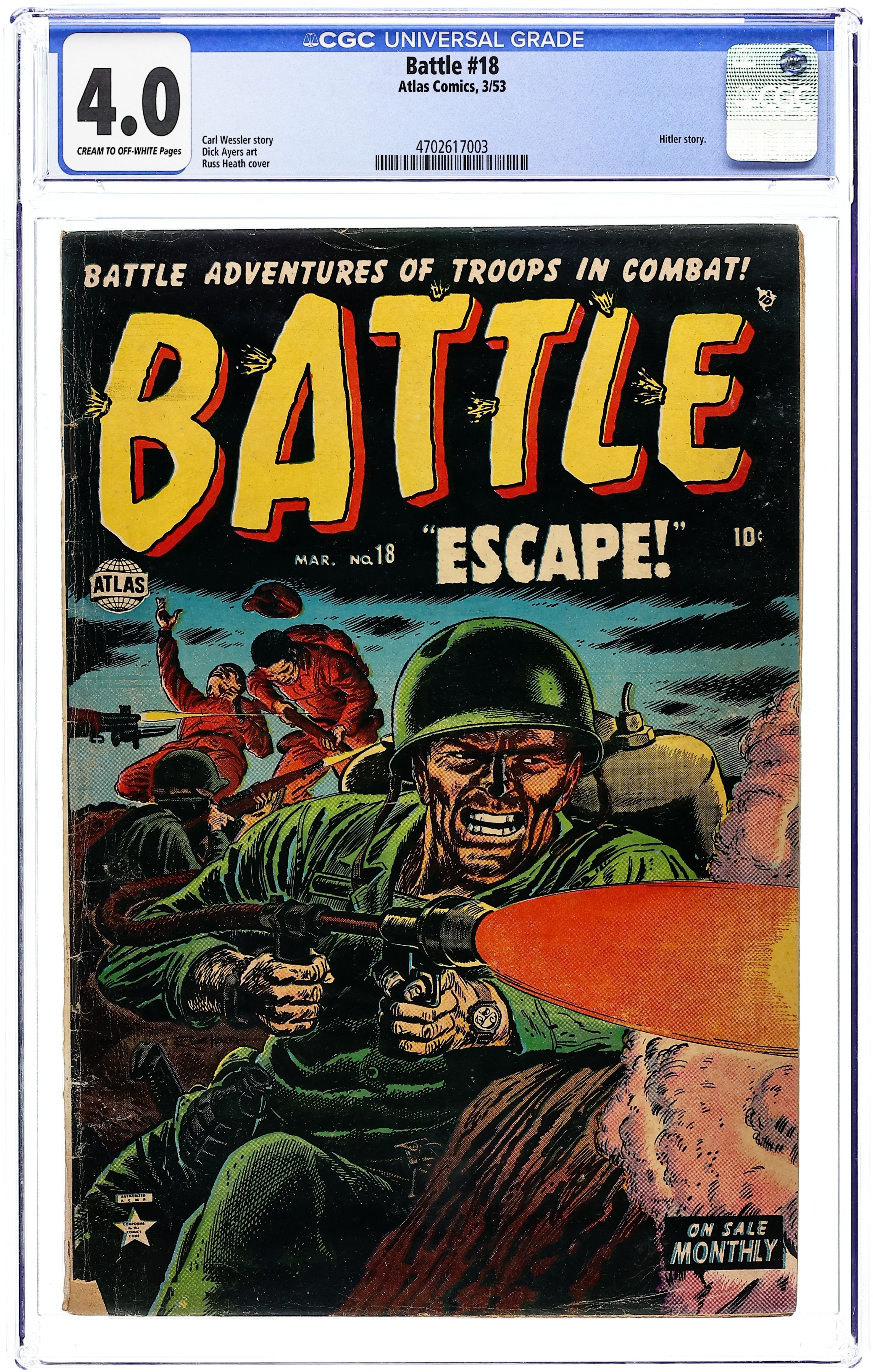 "Escape!" (art by Dick Ayers), the conclusion of the Hitler Chronicle in "The Beast at Bay" (art by Ayers), "The Black Hole!" (art by Miller), "Tank," and a two-page text story, "Corporal Charles Cassidy Captures Korea." Russ Heath cover. Cover price $0.10.